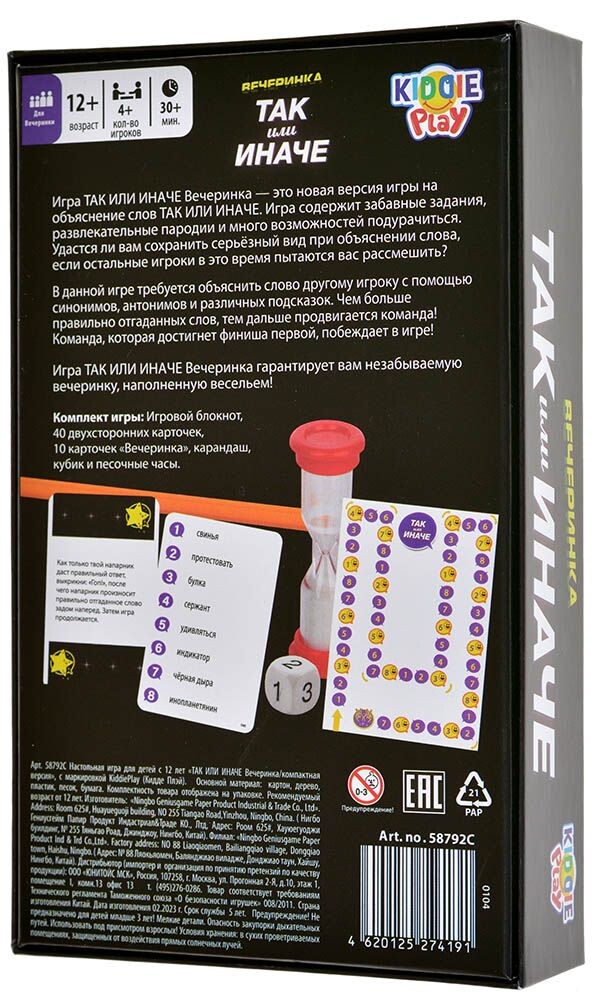 В небольшой коробке игроки найдут карточки со словами и песочные часы. Поделившись на команды по два человека, участники объясняют друг другу слова с карт, не используя однокоренные и стараясь объяснить как можно больше за одну минуту. Сколько отгадает напарник, столько победных очков получит команда! Помимо классических карт, данная версия содержит карты "вечеринки" - особые задания, разнообразящие игровой процесс. Данная компактная версия отличается от обычной меньшим количество карт и специальным блокнотом для записи победных очков вместо игрового поля. Но, поверьте, веселья от этого будет ничуть не меньше.