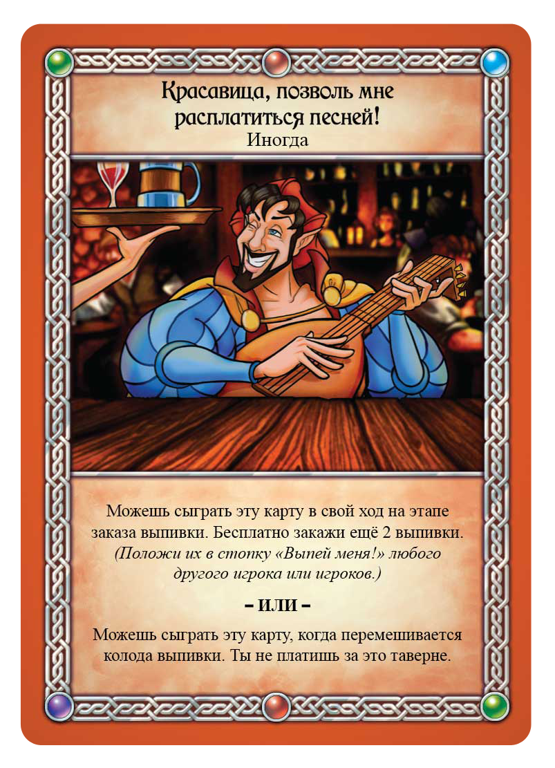 Новые герои в таверне! Вас ждет яростное карточное противостояние, полное веселья и горячительных напитков. В коробке вы найдете четыре колоды разных персонажей, обладающих уникальными умениями и способностями. Получив на руки планшет трезвости и золотые монеты, игроки стараются довести трезвость соперников до минимума, стараясь сохранить свои монеты. Познакомьтесь с новыми персонажами - полуогром, сильным воином,бардом, способным очаровать любого своими балладами, иллюзионисткой, способной затуманить разум соперника и дварфом, делающим тайники с золотом. Применяйте специальные карты, замедляйте своих противников, следите за уровнем трезвости и не растеряйте свои финансы! Данный набор можно соединить с оригиналом, а можно играть и отдельно. *Внимание! Данная игра предназначена для лиц старше 18-ти лет.