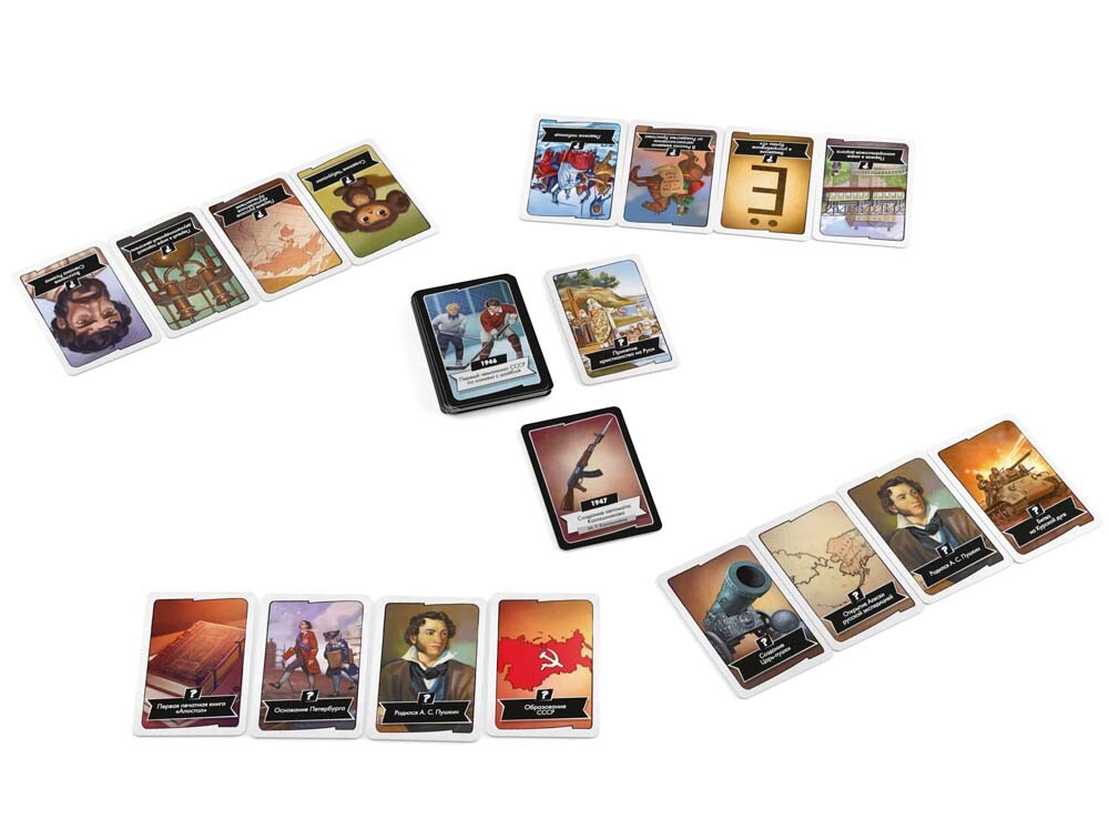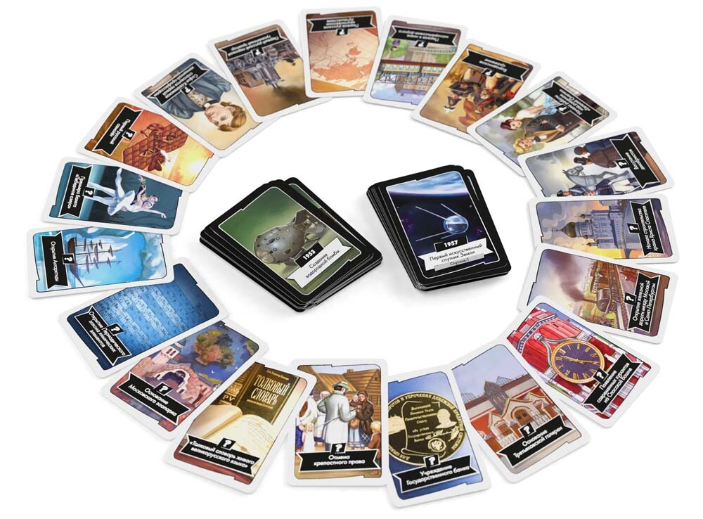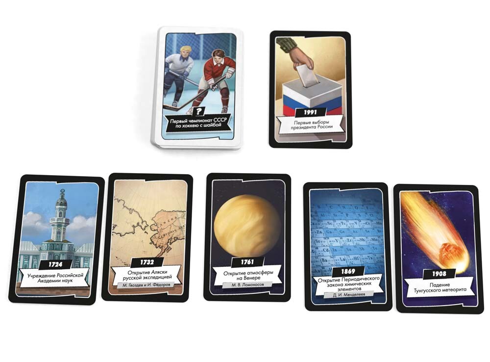 Данная викторина предложит вам посоревноваться в знании истории России. На карточках из коробки вы найдете множество красочных иллюстраций и описания к ним, в которых содержится информация о различных знаковых событиях, таких как изобретения, открытия, и памятные даты. Все эти вещи происходили в определенные даты, и вам необходимо выложить карты в хронологическом порядке. После того как все игроки закончат, останется только проверить друг друга. Переверните карты и посмотрите на даты - тот из игроков, кто будет ошибаться меньше других, станет победителем!
