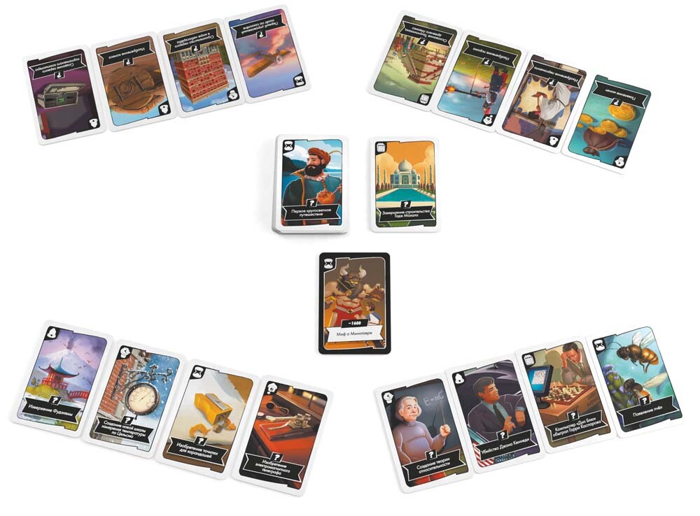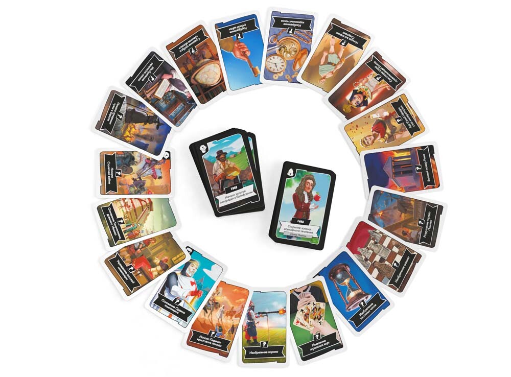Проверьте свои знания! В коробке вы найдете множество карт с описанием различных знаковых событий мировой истории. Игрокам необходимо выложить эти карты в правильном порядке по датам и времени происходящего. В новом выпуске познавательной соревновательной викторины вас ждет отличие от остальных игр серии - теперь вам необходимо класть карты как по датам в прошлое, так и в будущее. Когда все игроки закончат, переверните карты и проверьте указанные даты. Тот из участников, кто будет ошибаться меньше прочих, станет победителем!