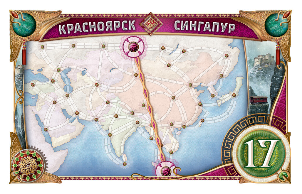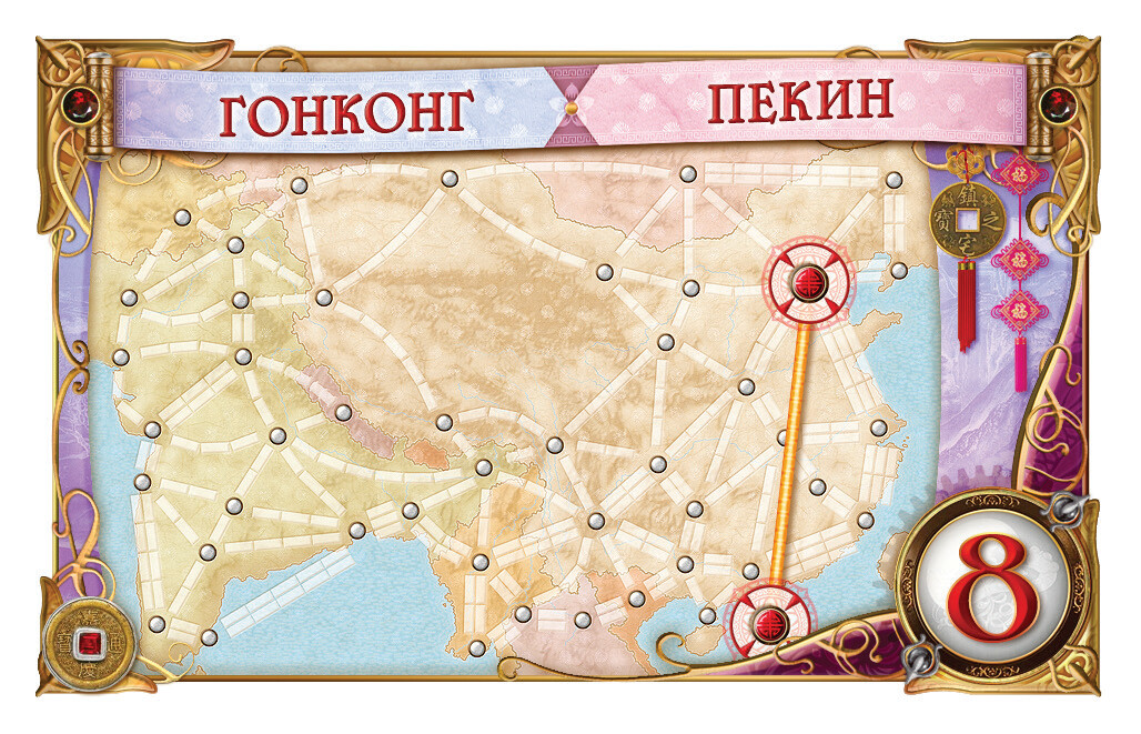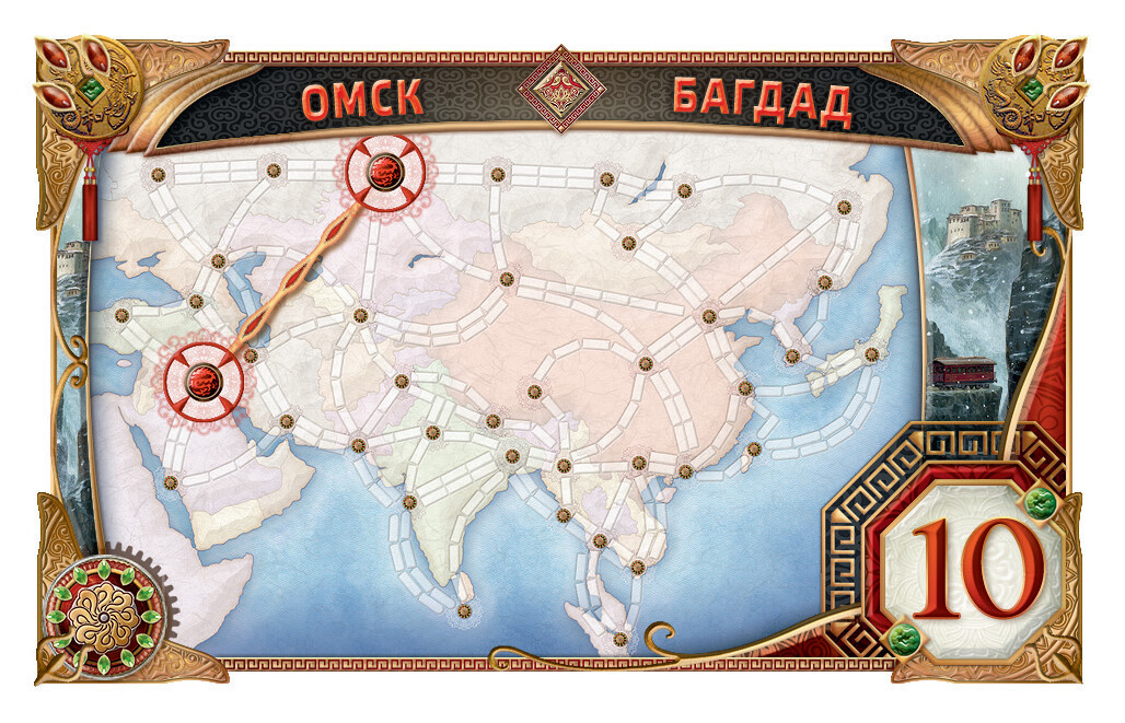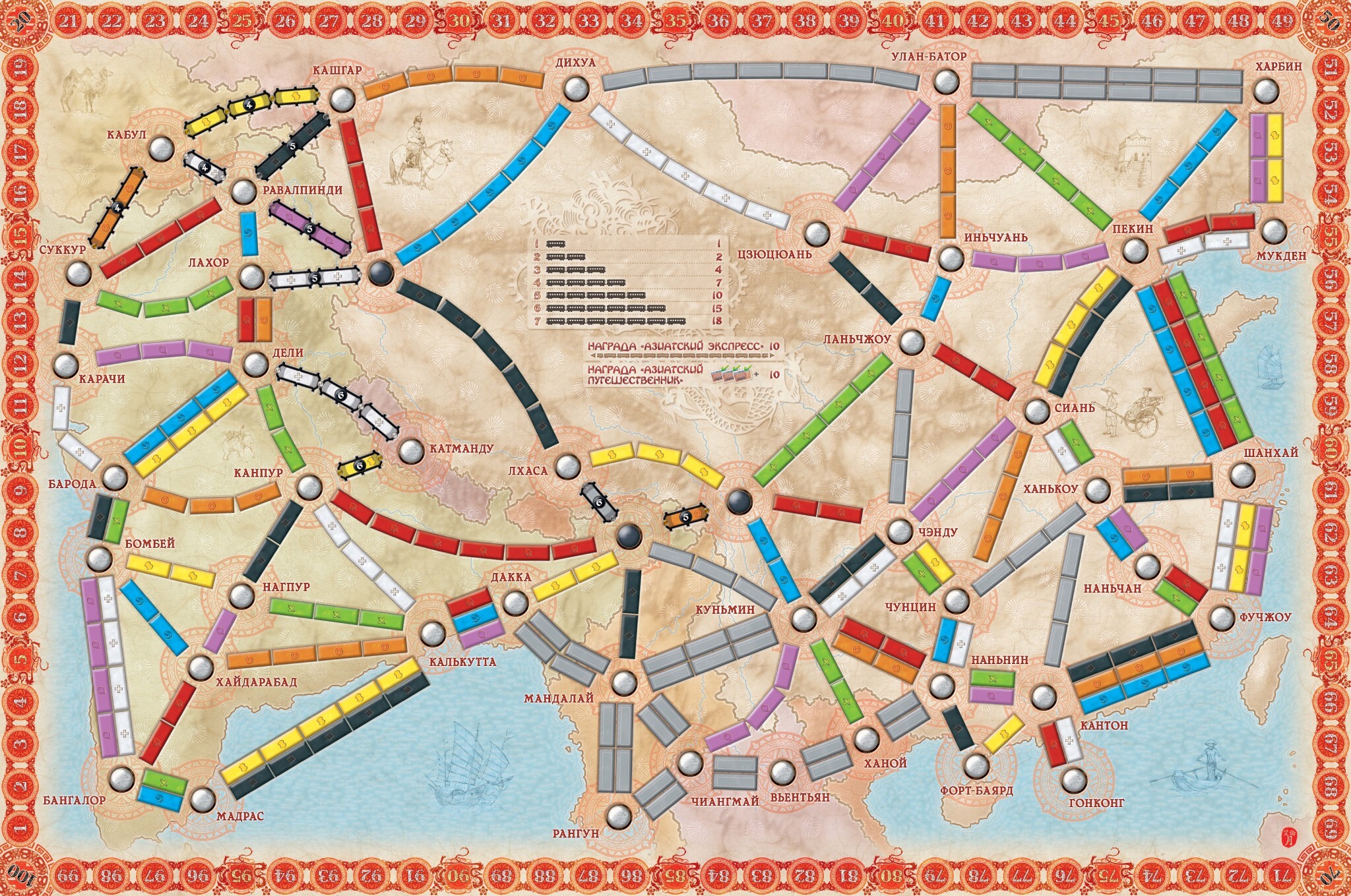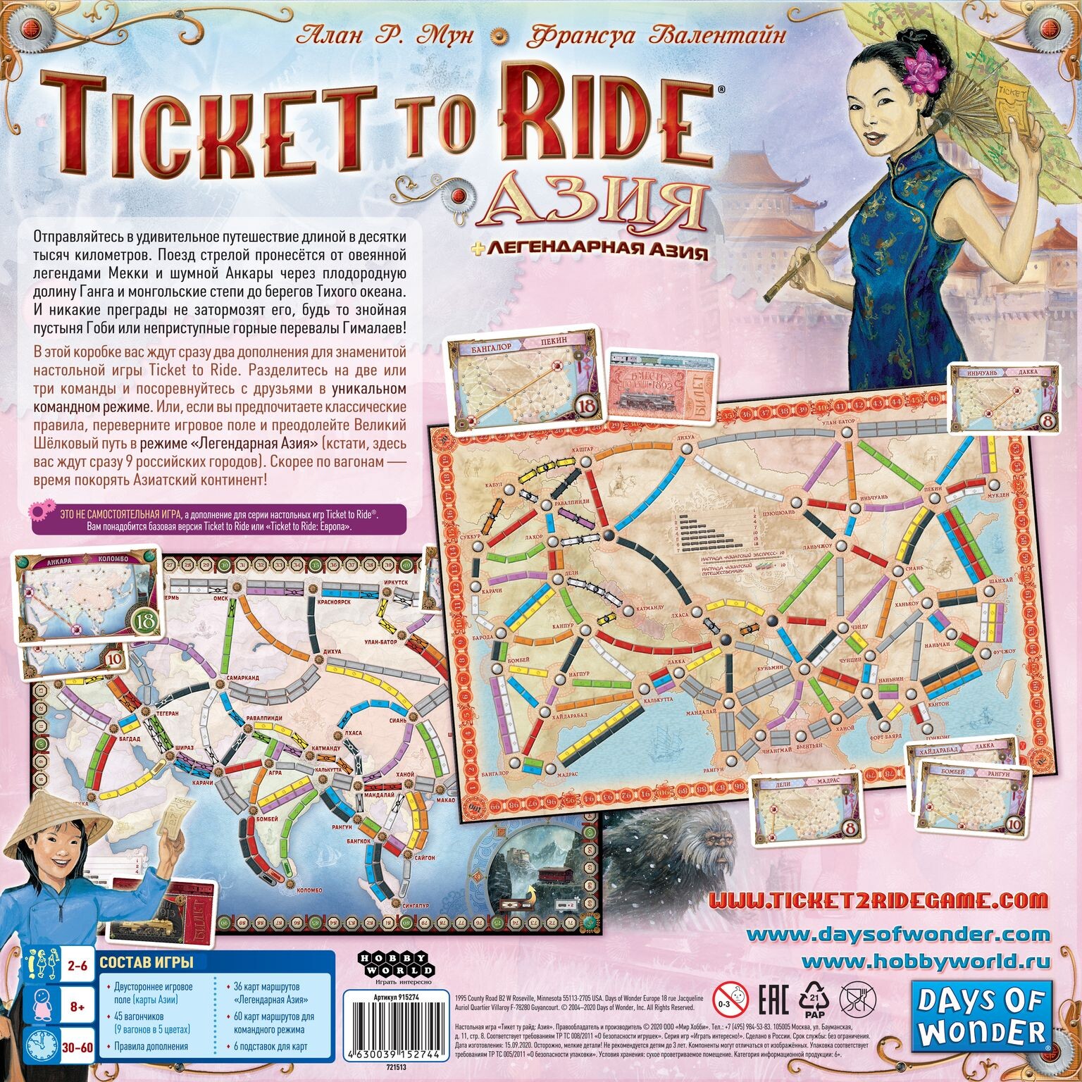 В комплекте "Азия" четыре или шесть игроков соревнуются в командах по два игрока. У каждого появляется своя тайная рука карт и билетов, вдобавок к остальным картам и билетам.