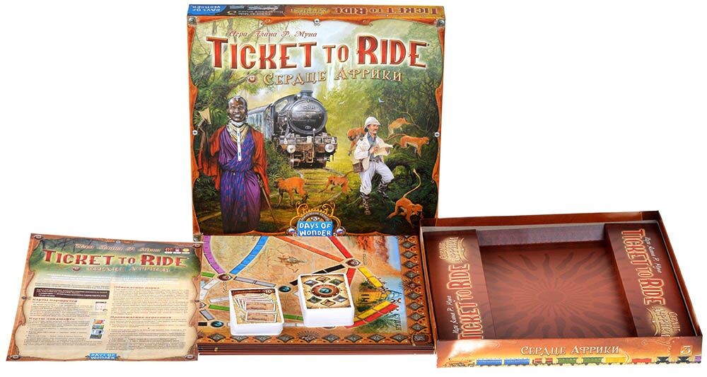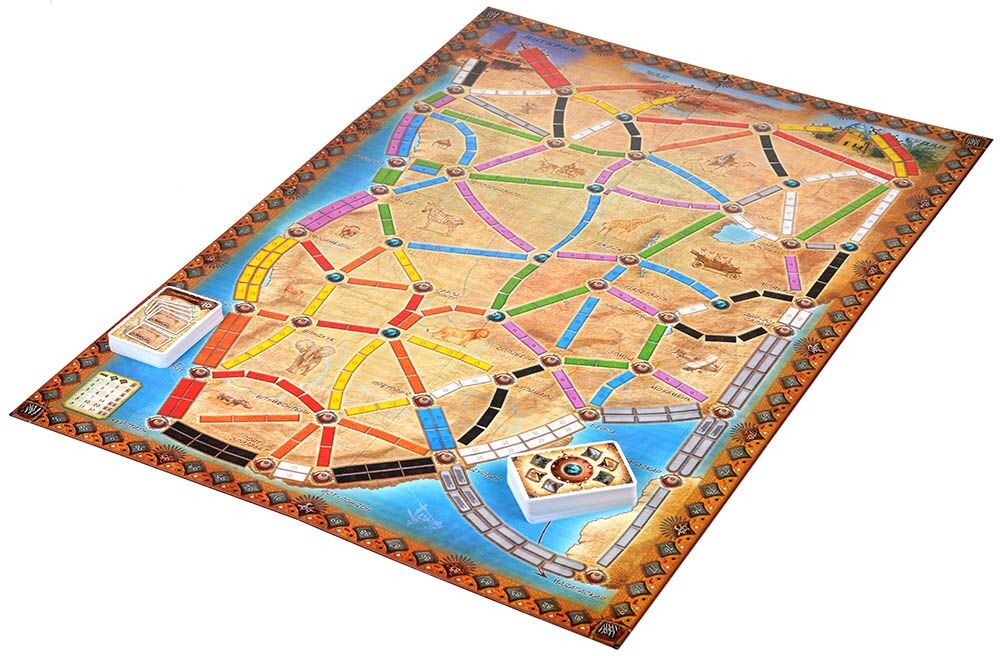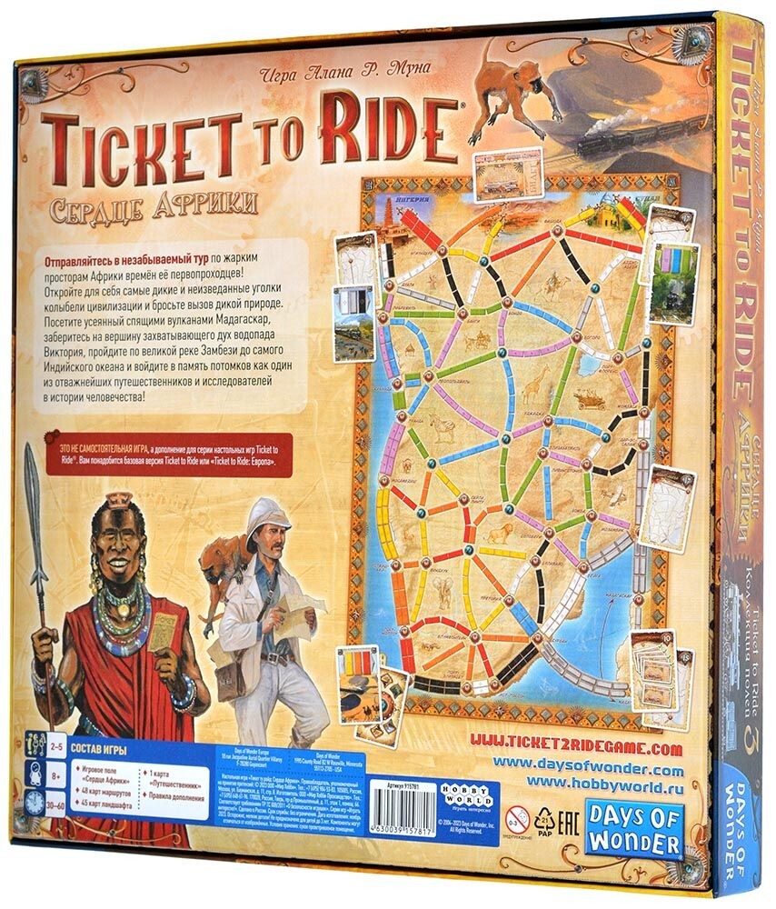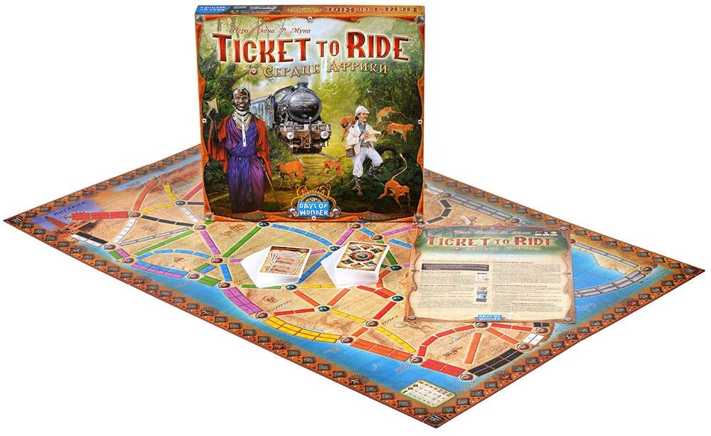 В данном расширении для знаменитой игры вас ждет сорок пять новых карт местности, разделяющихся на типы. Подобно картам поездов, игроки смогут использовать карты местности - от бескрайней пустыни до сочных джунглей, и получать таким образом более ценные для себя маршруты. Ознакомьтесь с картой Африки и попробуйте привычное соревнование по новым правилам!