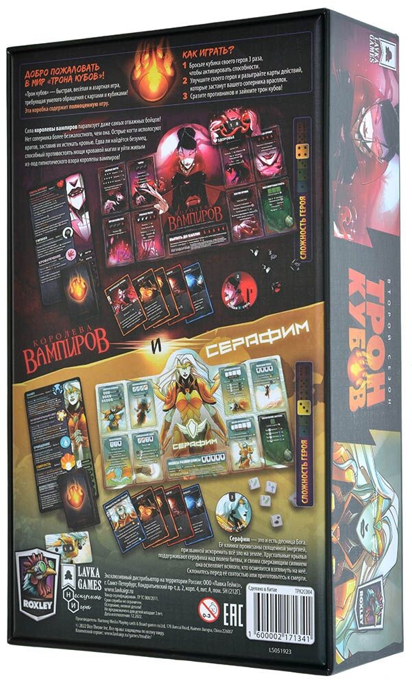 В новом красочном выпуске популярной батальной серии игроков ждут два новых героя со своим вооружением и уникальными особенностями для состязаний. Серафим, летящая на крыльях и вооруженная клинками ангелов, столкнется с вампирской королевой, способной нанести серьезный урон своими острыми когтями. Бросайте кубики и применяйте способности, основываясь на выпавших значениях. Попробуйте сбить здоровье вражеского героя до нуля и стать победителем!
