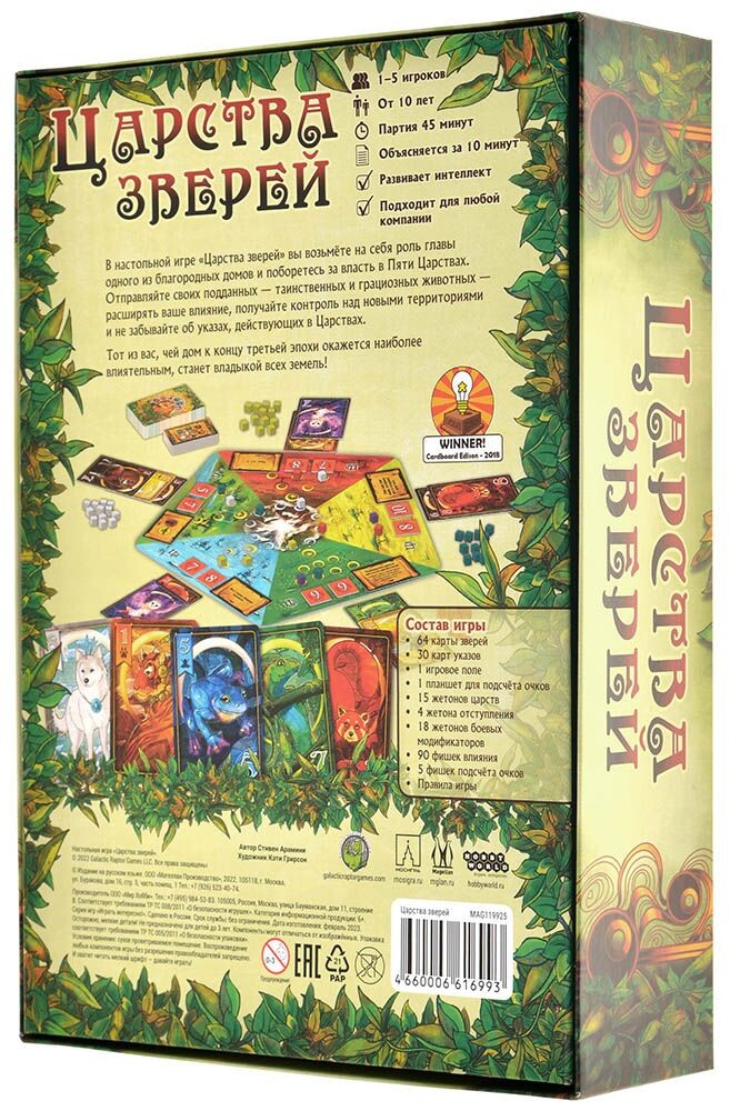 Приготовьтесь к серьезному сражению! Игрокам предстоит выбрать одну из пяти сторон и поучаствовать в битве зверей друг с другом. Великие дома решили сойтись в противостоянии, и теперь вам нужно доказать свои тактические возможности. С помощью карт участники смогут захватывать территорию, участвовать в битве между животными напрямую и получать очки влияния. Стоит заметить, что весь игровой процесс корректируется специальными приказами, дающимися в начале игры. Благодаря этому вы, к примеру, не сможете выложить определенного зверя, если его значение не подходит под текущий указ. Игра делится на несколько эпох, и в завершение каждой идет подсчет очков влияния. После трех этапов игры тот дом, который наберет наибольшее количество очков за свои действия, станет главной силой на игровом столе и подчинит себе всех остальных!