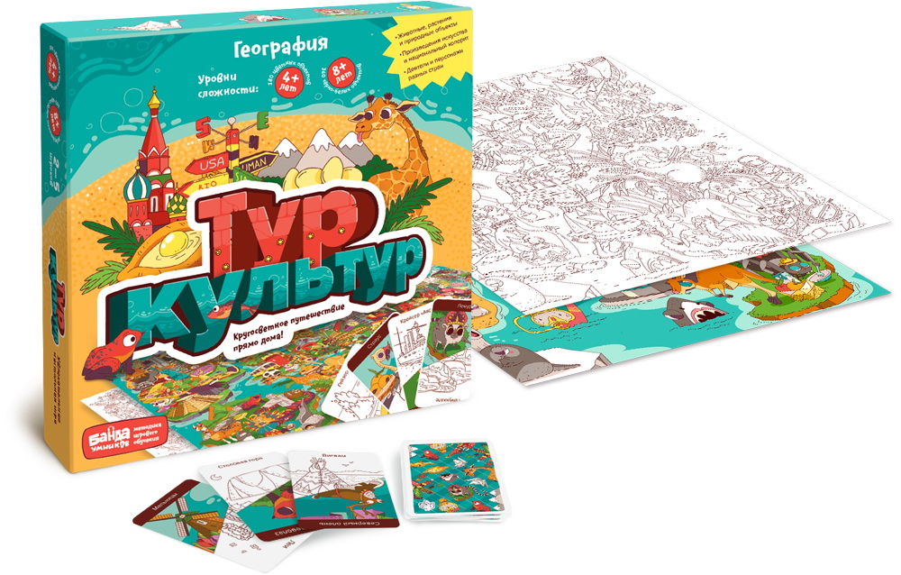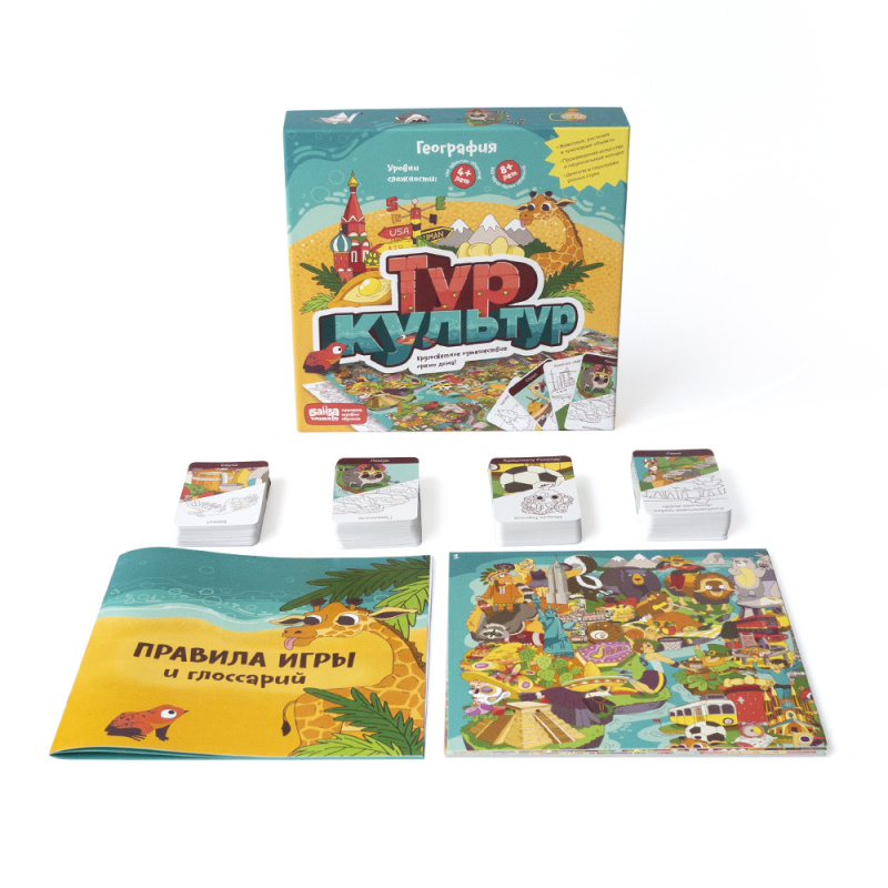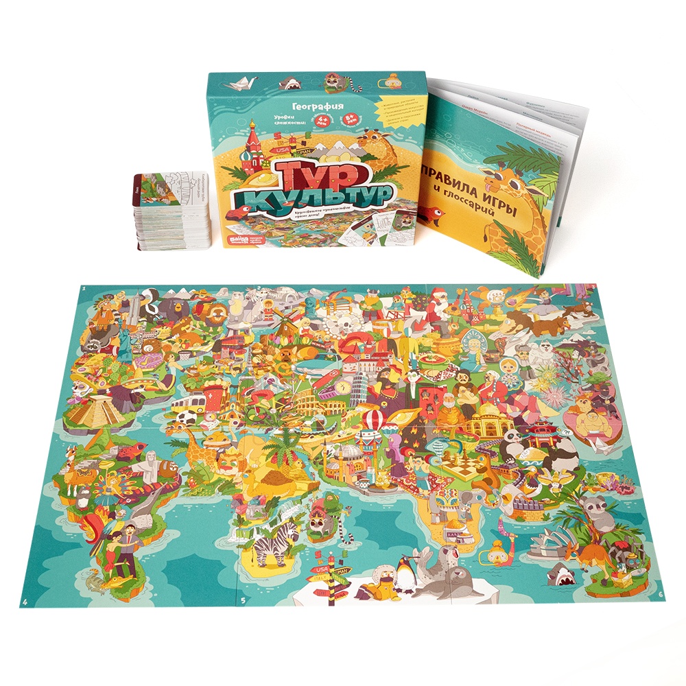 Игра «Тур культур» помогает изучать географию, глядя на неё с неожиданной стороны. С ней дети весело познают нашу планету и увлечённо соревнуются в знании стран, материков и океанов. Географические объекты, культурные явления, великие деятели, удивительные растения и непохожие друг на друга животные всего мира — все они уже ждут, когда ваш ребёнок откроет их для себя!