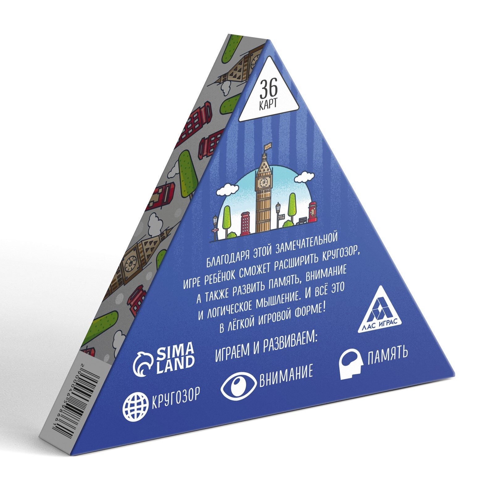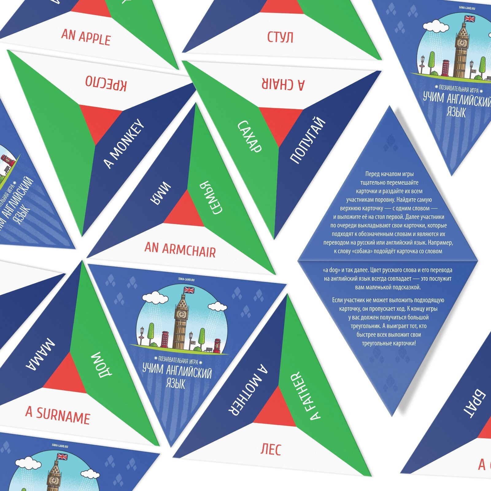 Внутри коробки вы найдете треугольные карты с различными словами на английском, а также карты с их переводом. Все участники берут себе карты на руки, а затем по очереди выкладывают их на стол одна к другой, ориентируясь по соответствию слов и его значения. Первый из игроков, кто таким образом избавится от всех своих карт, станет победителем!