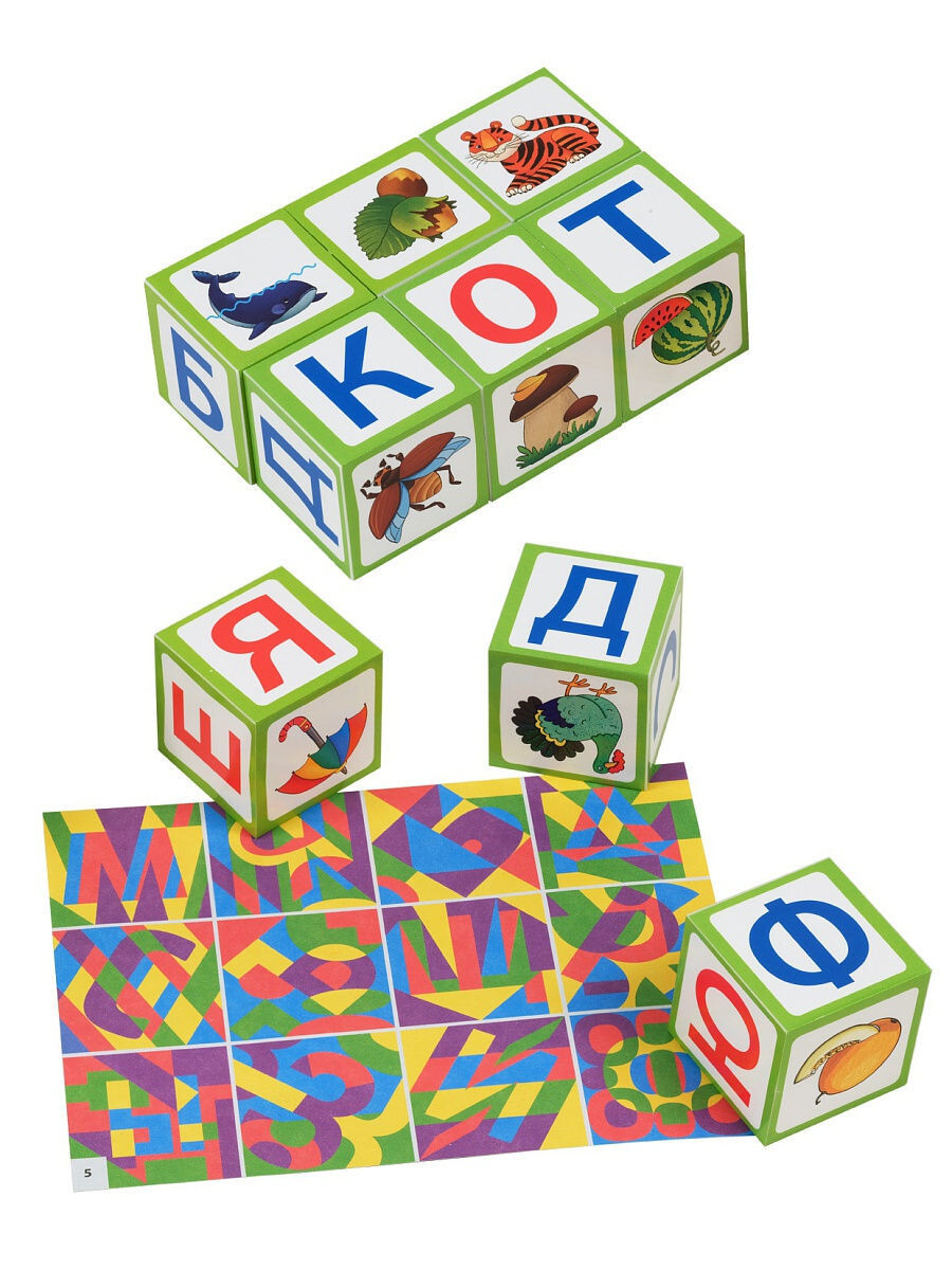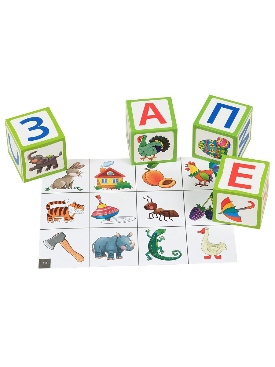 В комплекте вас ждет набор кубиков с буквами, карточки и книга со множеством заданий, благодаря которым ребенок легко и весело научится различать буквы на слух, составлять из букв слова, а также собирать слоги.