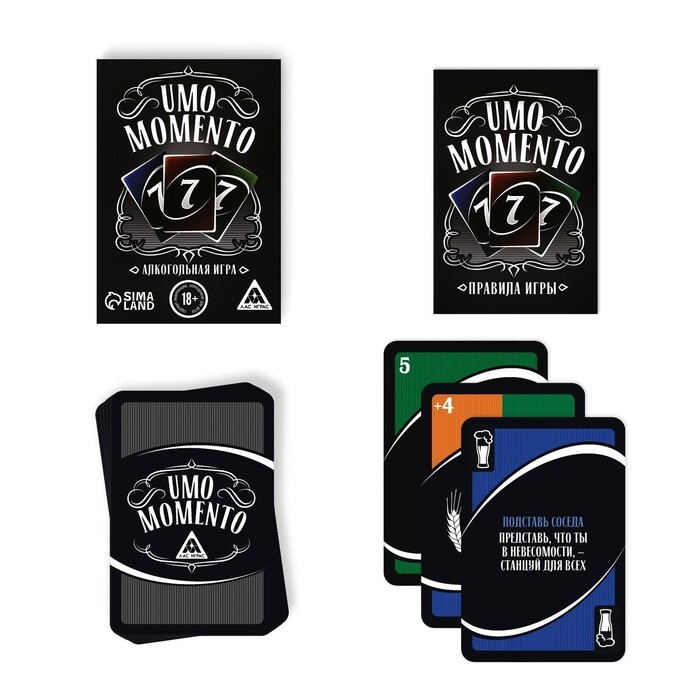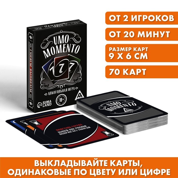 Данная веселая игра приукрасит любую вечеринку! В небольшой коробке вы найдете карты разных цветов с разными цифрами, а также специальные карты с безумными эффектами. Игрокам необходимо будет выкладывать карты по цвету, либо по цифре, стараясь избавиться от всех карт на руках. При этом, специальные карты помогут замедлить соперников и получить преимущество. Данное карточное противостояние выполнено в алкогольной тематике, а потому запрещено для лиц младше 18-ти лет.