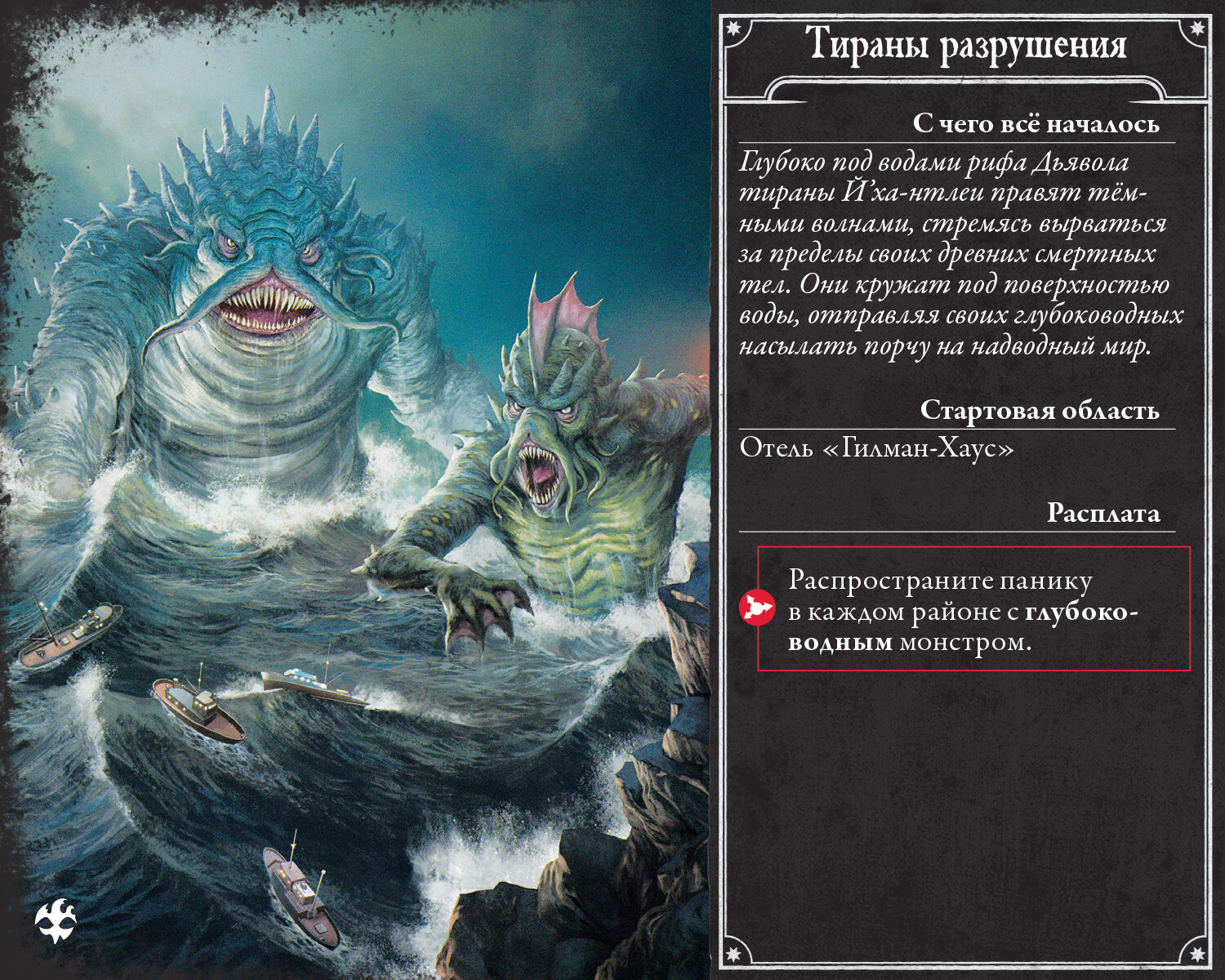 Кошмарные чудовища из морских глубин уже готовы выбраться на сушу... А игрокам вновь нужно дать отпор приближающейся угрозе! Данное дополнение предлагает четыре новых сценария, полных разветвленных и увлекательных историй. Помимо этого, вас ждут новые персонажи, предметы и монстры, обладающие теперь новыми возможностями и способные усложнить жизнь игрокам еще сильнее. Ужас медленно распространяется по городу, и жителей одолевает безысходность, влияющая на игровую партию. А если приключение покажется вам слишком сложным, вы можете ознакомиться с новой системой уровней сложности для каждого сценария.