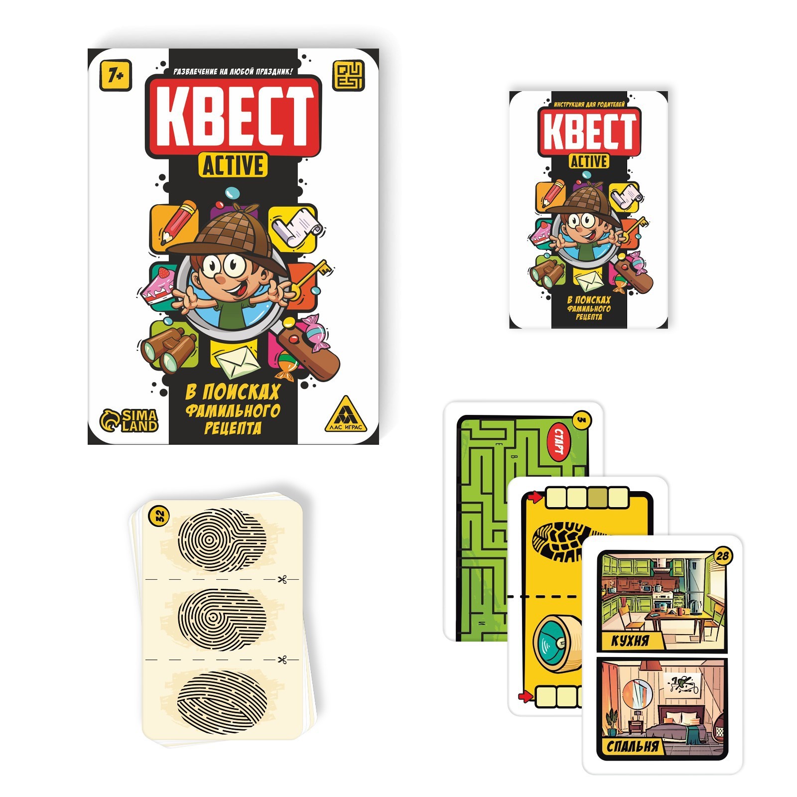 Кто сможет найти фамильный рецепт? Игроки могут выбрать количество локаций, в которых будет происходить поиск. Выложите карты в колоду по порядку, и начинайте приключение, предварительно спрятав карту рецепта в любую книгу. Участники следуют подсказкам и решают головоломки, чтобы отыскать нужную карту. Получится ли у них достичь финиша приключения?