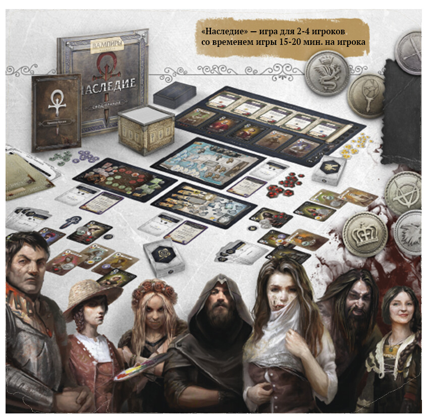 В настольной игре "Вампиры: Маскарад – Наследие", основанной на знаменитой ролевой вселенной, игроки возьмут на себя роль могущественных вампиров, и пройдут долгих путь через эпохи и исторические события. Бессмертие обладает своими преимуществами, поэтому по ходу игры вы встретите знаменитых исторических личностей, и даже сможете поучаствовать в их судьбе! Механика "наследие" повлияет на финал, поэтому, хоть главы не сильно связаны между собой, все они в конечном итоге, соединятся в одну большую и кровавую историю. Формируйте персонажей по их родословной, улучшайте их, избегайте инквизиции, влияйте на судьбы и приведите свой вампирский клан к победе, - в данной игре возможно все!
