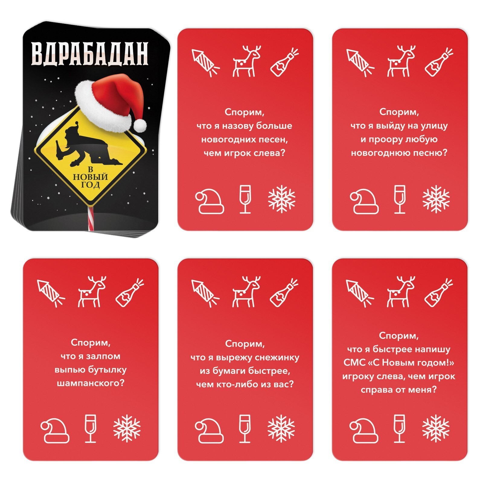 Вечеринка начинается! В коробке вас ждет множество карт с различными правилами, подходящими для праздника. Игрокам предлагается на спор выполнить множество веселых, а порой и безумных заданий. Участники делают ставки с помощью специальных жетонов, и если игрок справится, отдают ему их. Тот из участников, кто сможет набрать наибольшее количество жетонов, станет победителем!