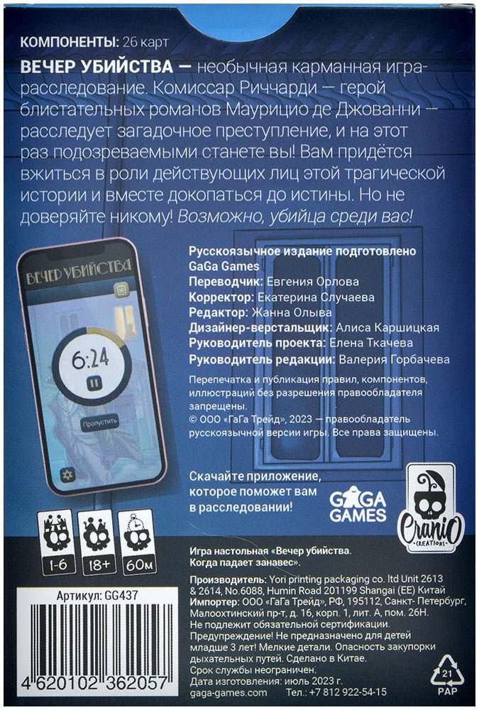 В данном карточном детективе вам предстоит стать подозреваемым, получив на руки карту персонажа. Каждый игрок сможет брать карты улик, но их количество будет различаться для разных участников. Общаясь между собой и сопоставляя информацию, игроки постараются собрать полную картину произошедшего. Через несколько раундов у вас появится возможность обвинить кого-нибудь. Но убийца среди вас постарается сделать все, чтобы уйти безнаказанным. Получится ли у вас найти виновника произошедшего и не обвинить невиновного?