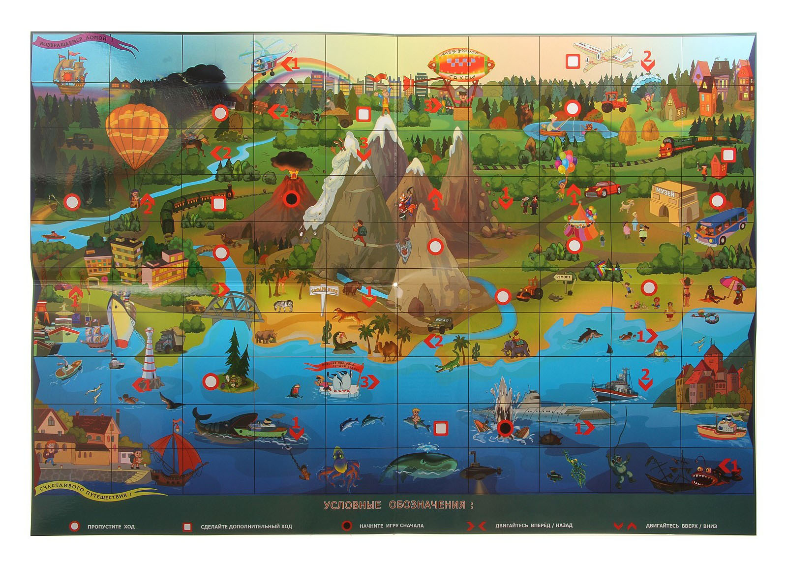 "Веселое путешествие" - классическая игра-бродилка с кубиками, в которой игрокам предстоит посоревноваться за право первым дойти до финиша. На большом красочном поле есть много областей, где игроки будут вынуждены пропустить ход, передвинуться в любом направлении, или вообще начать игру сначала! Более того, на обратной стороне поля вы найдете еще два поменьше - "Пираты" и "Змеи-лестницы", в которые также полноценно можно сыграть! Собирайтесь всей семьей и участвуйте в этой веселой гонке. Пора в путешествие!