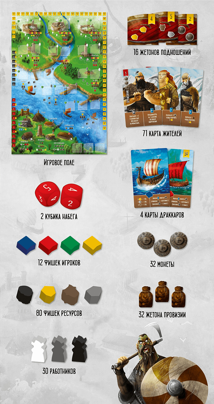 Впечатлить вождя викингов и заслужить почетное место в залах Вальгаллы - нет лучше награды для средневекового воина! В настольной игре "Викинги" игроки стараются получить победные очки, собирая команду, совершая набеги и захватывая поселения. Торопиться не стоит, ведь нужен провиант, необходимый для вылазки, и определенное количество экипажа. После набора достаточного количества провизии и наемников, викинги отправляются грабить форпосты, монастыри и крепости. Золото, железо и домашний скот - выгодная добыча, и то, как вы ей распорядитесь, также повлияет на победу. Когда для набегов останется только одна крепость и все подношения сделаны, игра завершается и следует подсчет очков. Почувствуйте себя настоящим викингом!