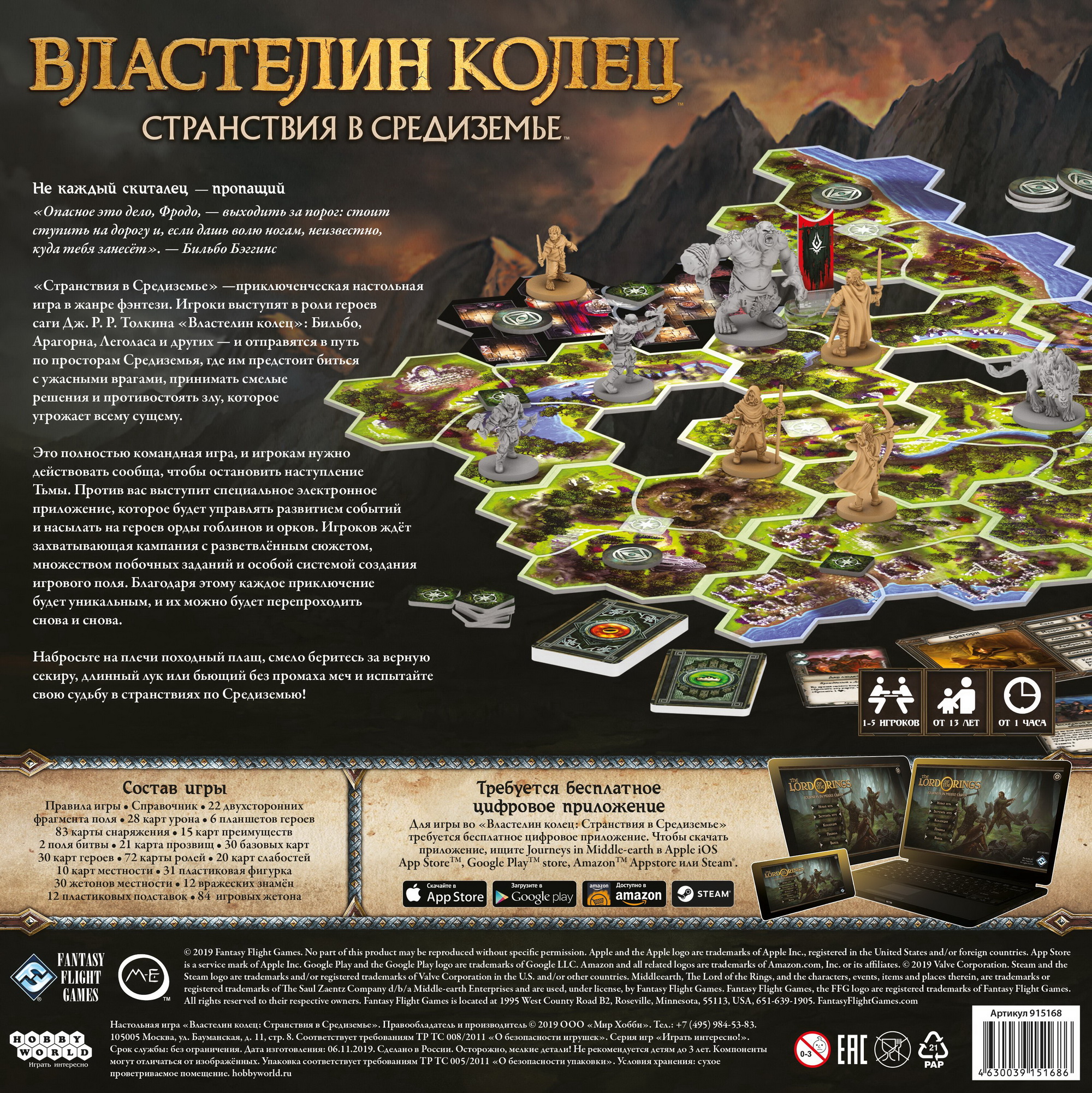 "Властелин колец: Странствия в Средиземье" - кооперативное приключение по Средиземью, где бравым воинам предстоит бороться с монстрами, использовать свои умения и исследовать зловещие руины, густые леса и ясные поляны. Основной игровой процесс крутится вокруг приложения-компаньона, которое формирует партии для игроков, давая указания по разведке территорий и передвигая врагов на карте. Благодаря этому, каждая партия станет отдельным увлекательным и неповторимым приключением, которое вы можете пройти компанией, либо в одиночку!