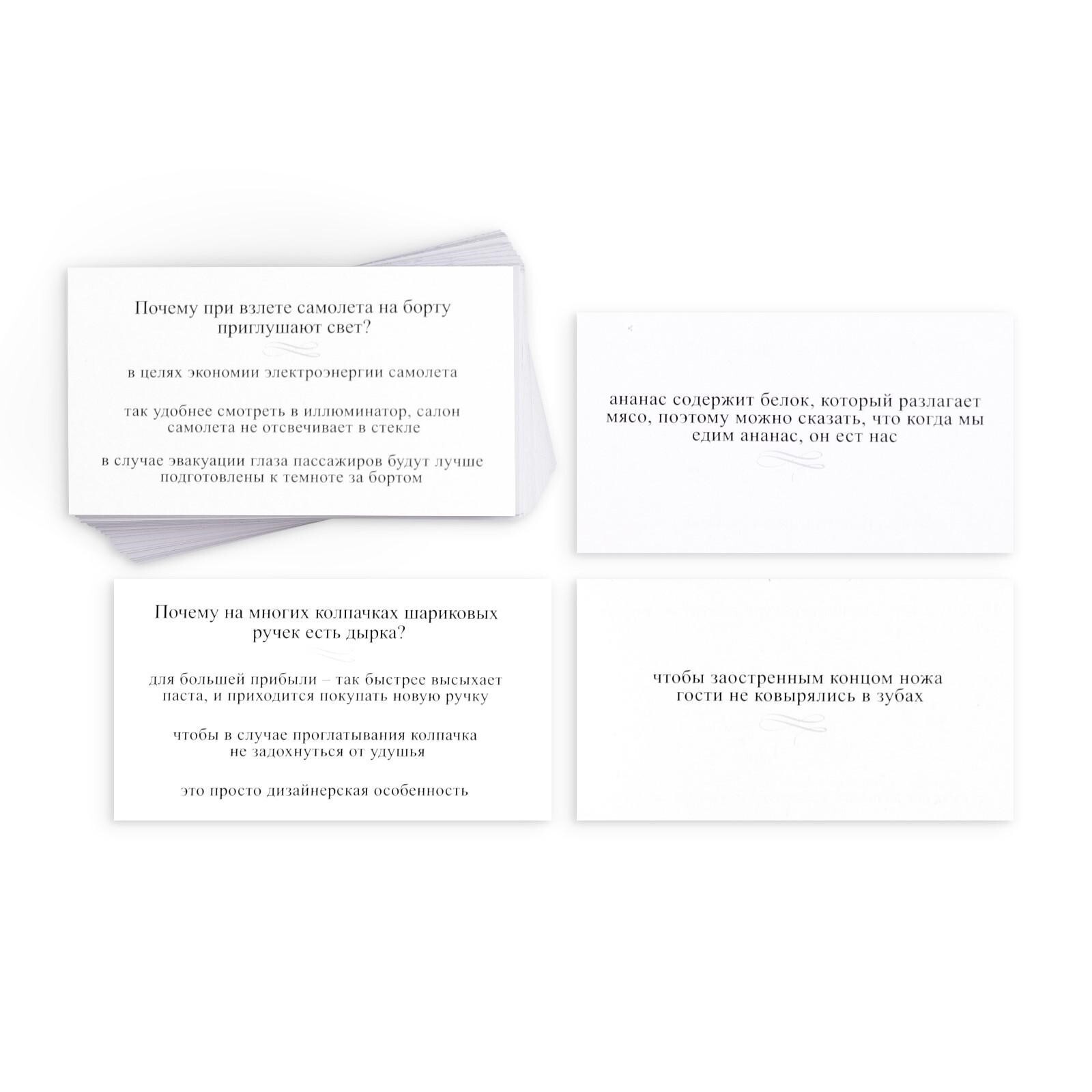 Данная викторина содержит множество карт с вопросами и вариантами ответа на них. Игроки по очереди берут карту и зачитывают вопрос, а также три варианта ответа. Кто сможет догадаться до ответа верно, получит победные очки. Игрок, чаще остальных отвечающий правильно, станет победителем!