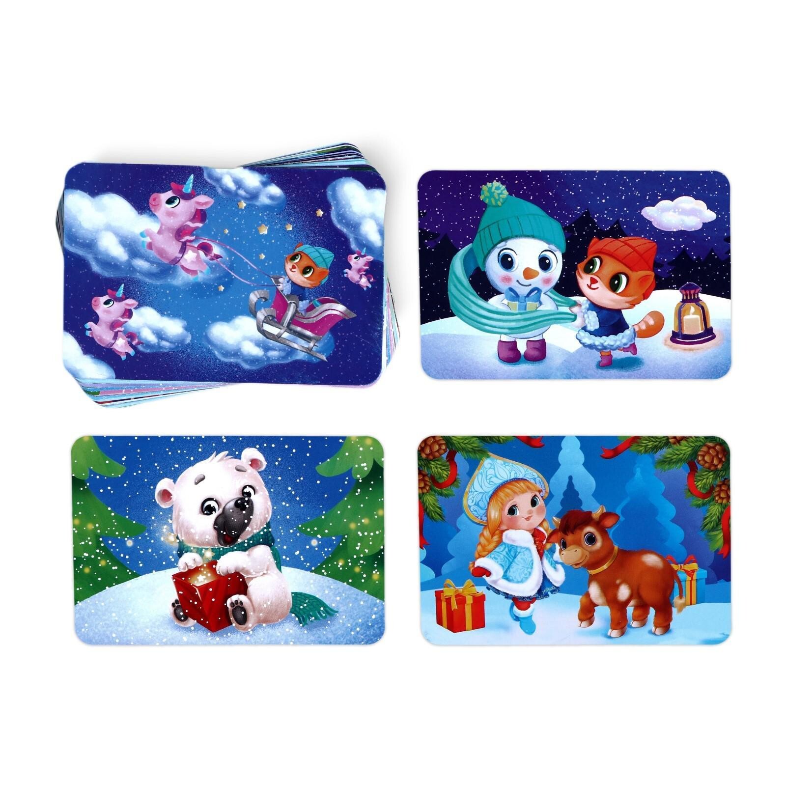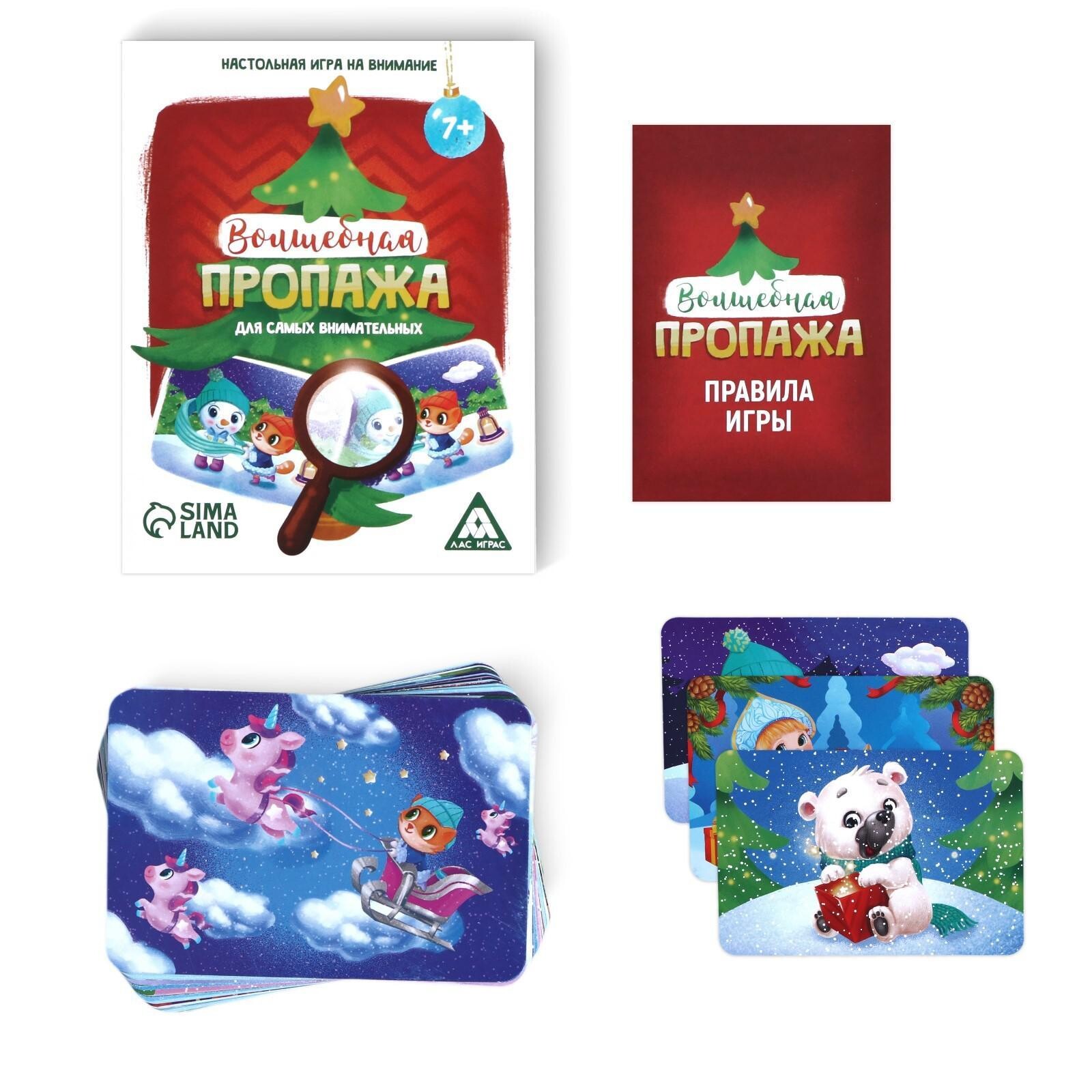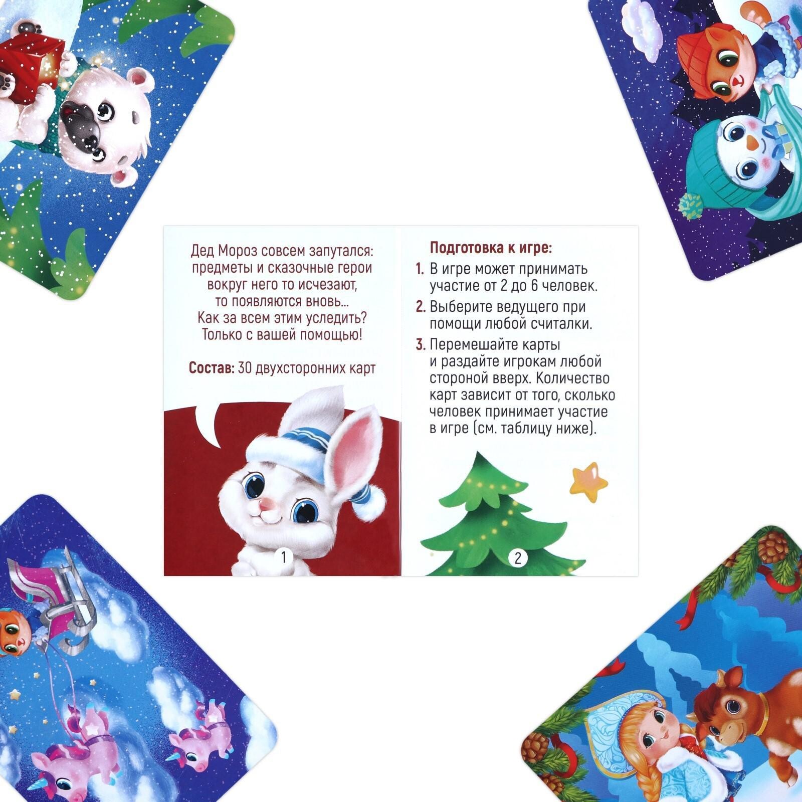 В данной игре вас ждут карточки с различными рисунками подарков и новогодних украшений. Каждый из участников получит на руки определенное количество карт, а также некоторые карты будут выложены в центр стола. Участники смотрят на карты на столе, после чего закрывают глаза, а ведущий убирает одну из них, и предлагает угадать, какая именно иллюстрация пропала. Тот из игроков, кто отгадает правильно, сможет выложить одну карту со своей руки в центр стола. А если он угадает неправильно, то одну карту придется взять. Участник, первым избавившийся от всех карт на руках, станет победителем!