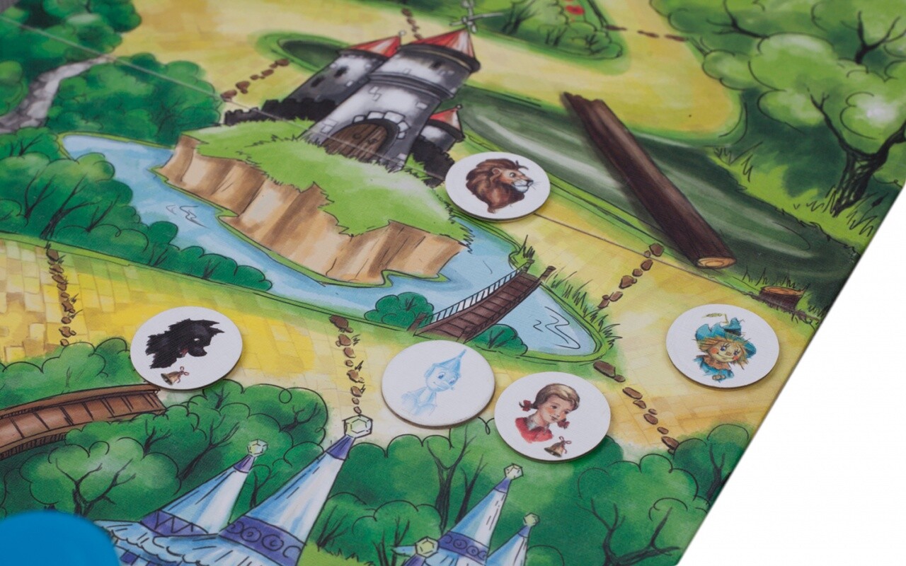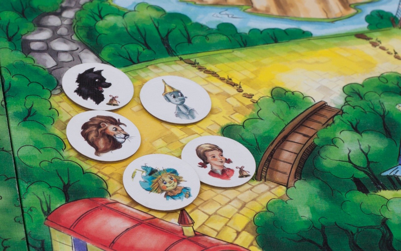 5 двусторонних фишек персонажей для перемещения по карте (Элли, Тотошка, Лев, Железный Дровосек и Страшила).
