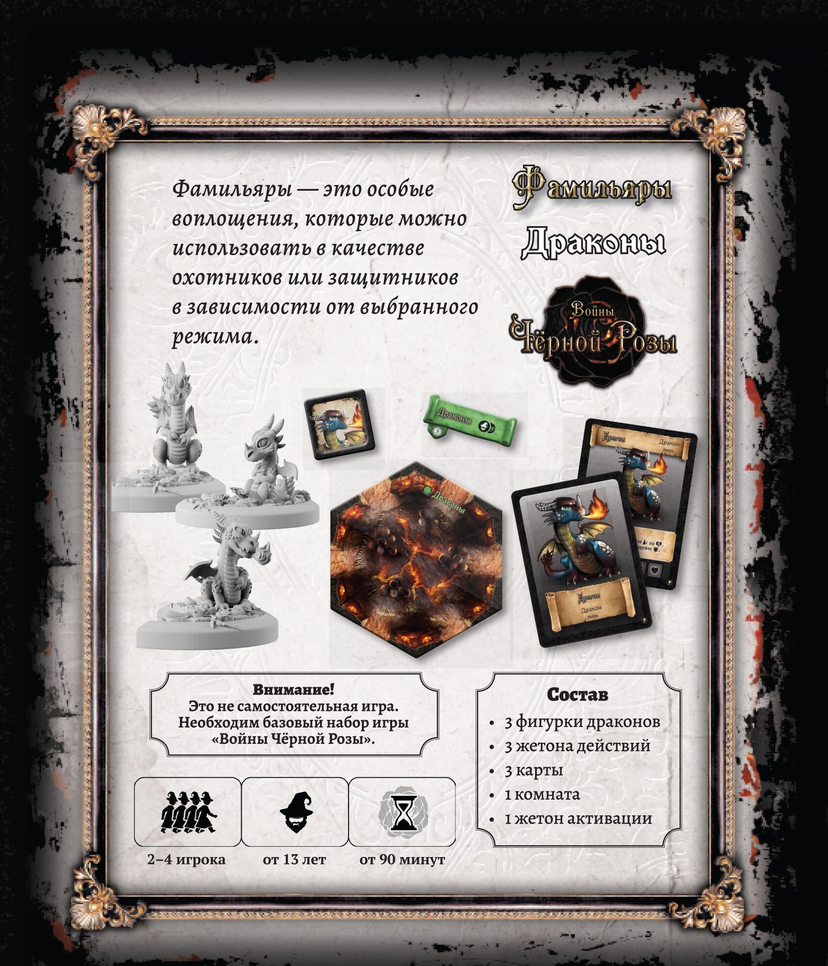 В небольшой коробке вы найдете три фигурки драконов с соответствующими картами, которые станут вашими верными союзниками и доблестными защитниками. Так называемые фамильяры будут принимать урон на себя, либо яростно атаковать соперника. Разыгрывайте карты, применяйте заклинания и накапливайте боевую мощь, чтобы победить!
