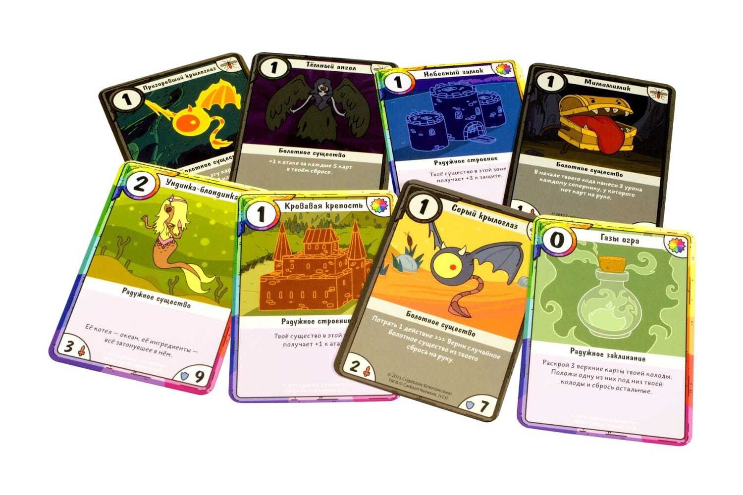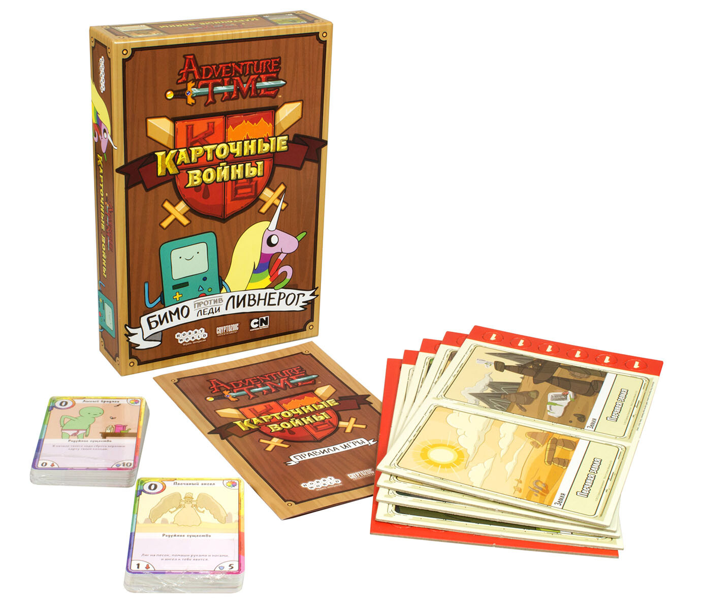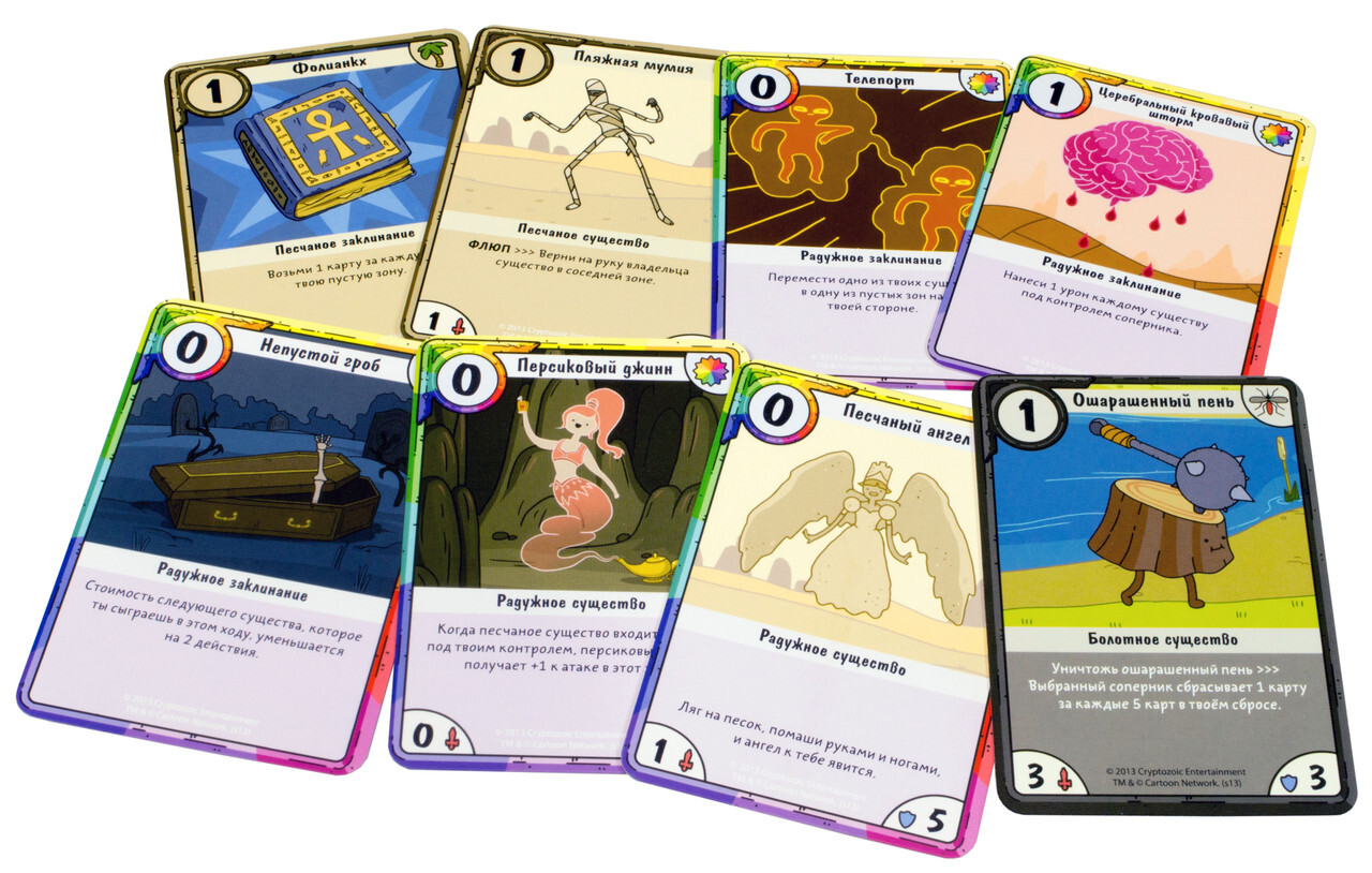 Герои знаменитого мультсериала сойдутся в великой битве! В настольной игре "Время Приключений. Карточные Войны: Бимо против Леди Ливнерог" игроки сражаются друг против друга, используя героев из культового мультсериала. В свой ход можно использовать очки действия, которые тратятся на карты существ, локация и заклинаний, которые выкладываются в определенный ряд. Каждому из дуэлянтов достается 25 очков здоровья, которые вы точно не захотите терять! Комбинируйте способности, грамотно разыгрывайте карты и наслаждайтесь красочным оформлением. При желании, данный выпуск можно смешать с другими, увеличив число игроков и тактических возможностей. Да начнется бой!