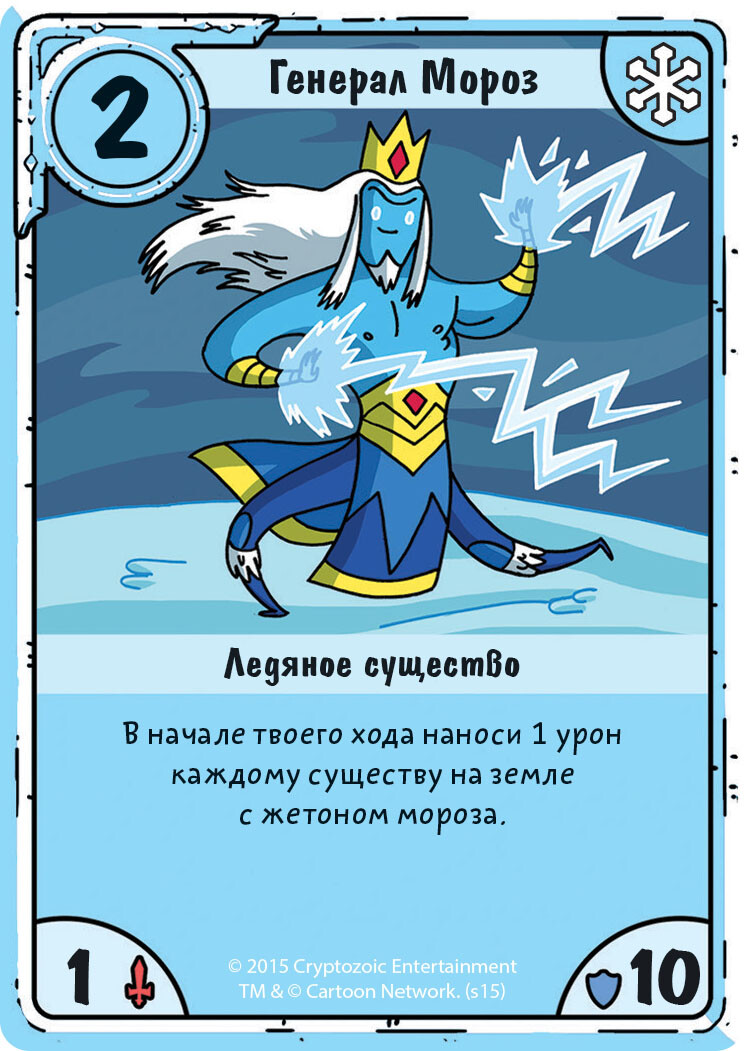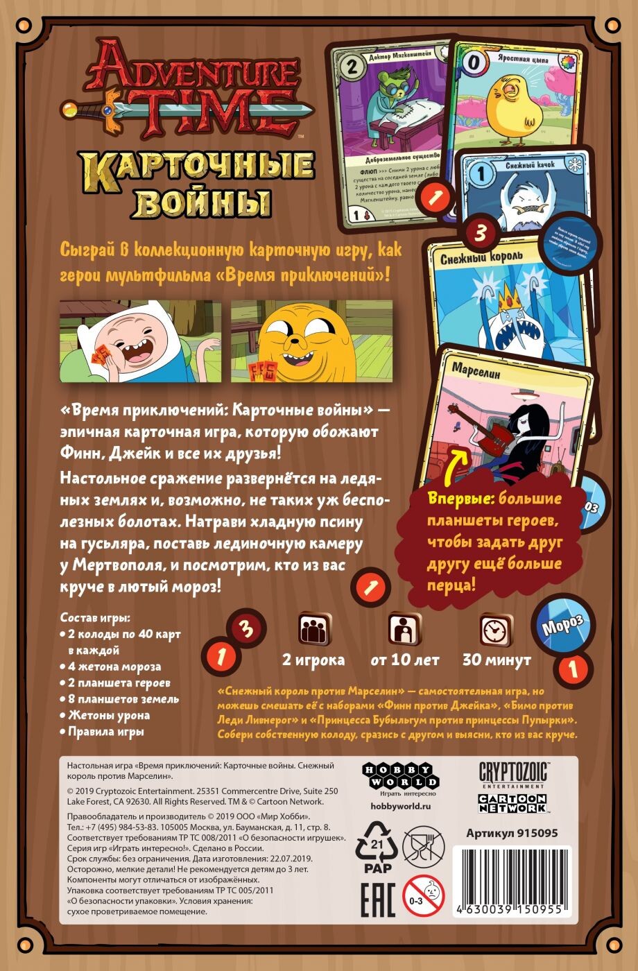 "Время приключений. Карточные войны: Снежный король против Марселин" - новый выпуск серии дуэльных игр, основанных на культовом анимационном произведении. Комбинируйте карты, призывайте существ и всячески замедляйте соперника - победителем будет только один! Снежный Король умеет подбрасывать морозные жетоны оппоненту, что значительно усложнит жизнь играющему. Но и у Марселин есть несколько хитрых приемов - в частности, Болотные существа, после ухода которых остается лишь хаос. Чью сторону вы выберете?
