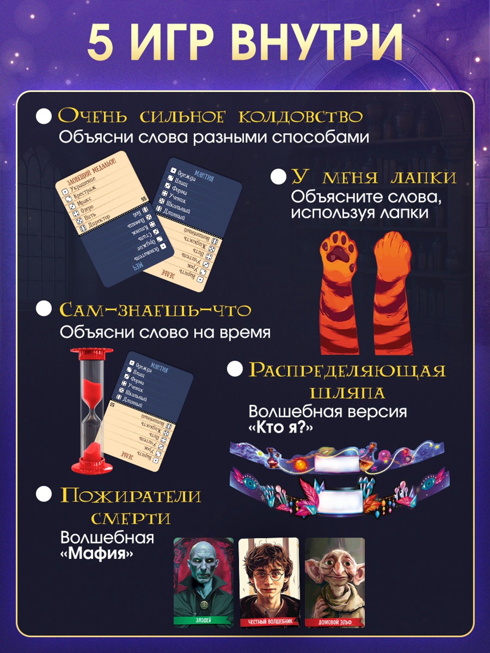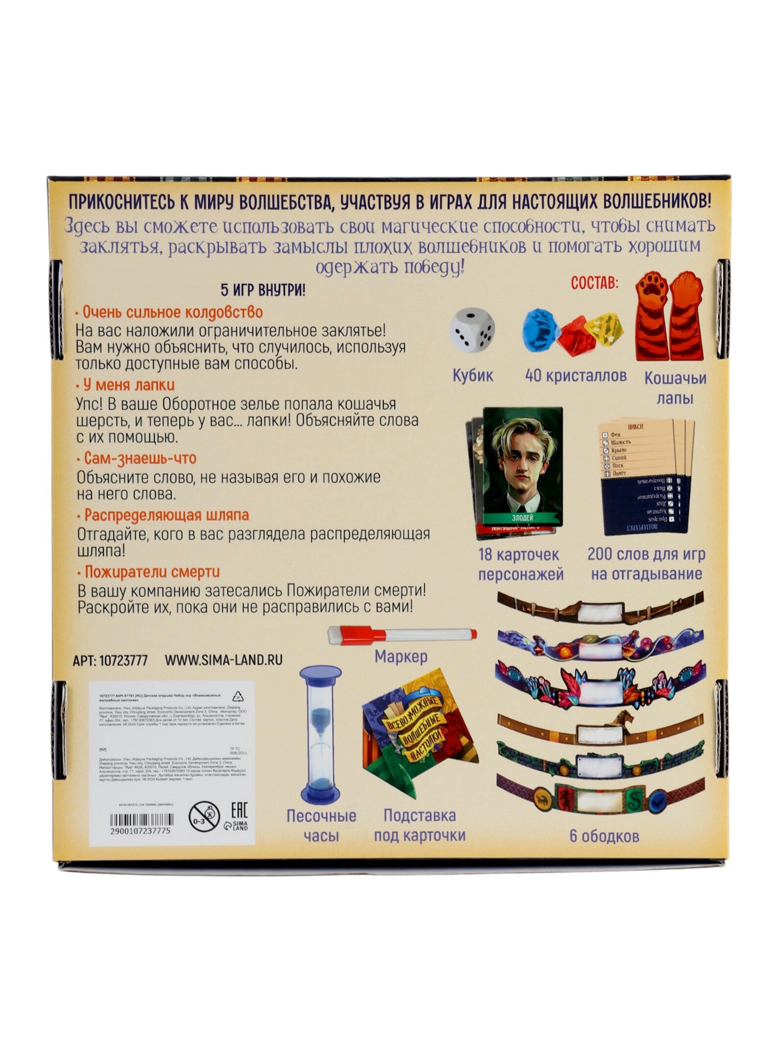 Кубик40 кристалловкошачьи лапы18 карточек персонажей200 карточек со словами6 ободковмаркерподставка под карточки