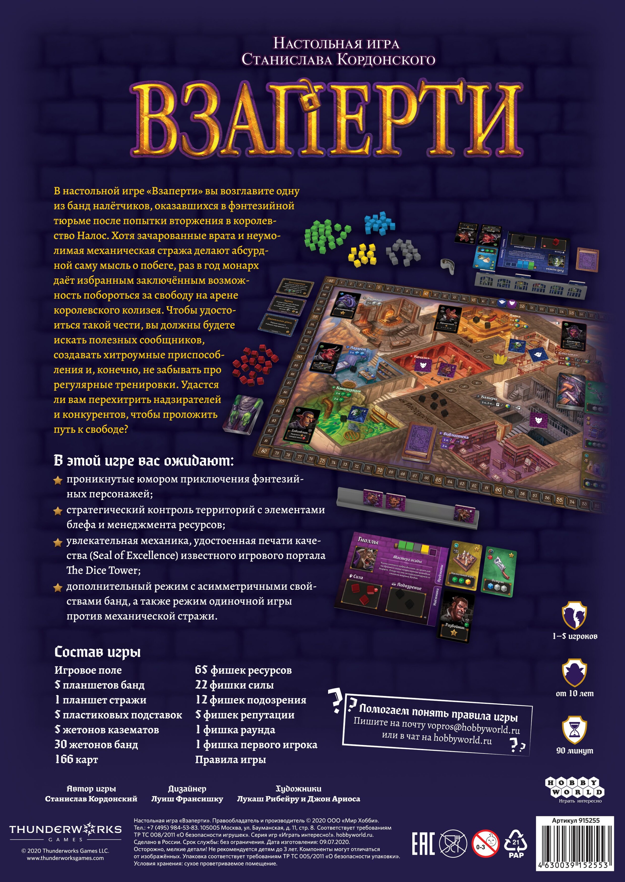 В жизни в темнице мало приятного. Условия суровые, охрана неустанно бдит, да и гоблины-сокамерники не блещут доброжелательностью. Из тюрьмы не выбраться, но бесцельно коротать свои дни тоже не хочется. Чем же заняться? В настольной игре "Взаперти" игроки управляют группами миньонов - юркими кобольдами, гоблинами и гноллами, и соревнуются в создании лучшей и самой сильной банды. В свой ход можно вербовать новых заключенных, создавать контрабанду, и получать за это звезды репутации. В тюремной библиотеке игроки смогут получить карты книг, обладающих особыми эффектами, что даст преимущество. Следует быть осторожным, ведь сильная банда может привлечь внимание охранников, а они еще и обыск устроят в камерах! По прошествии шести раундов, игрок, набравший больше всех очков репутации, объявляется победителем. Несколько видов правил и даже возможность игры для одного игрока, красочная рисовка и тактический увлекательный процесс, - все это ждет вас в игре "Взаперти!"