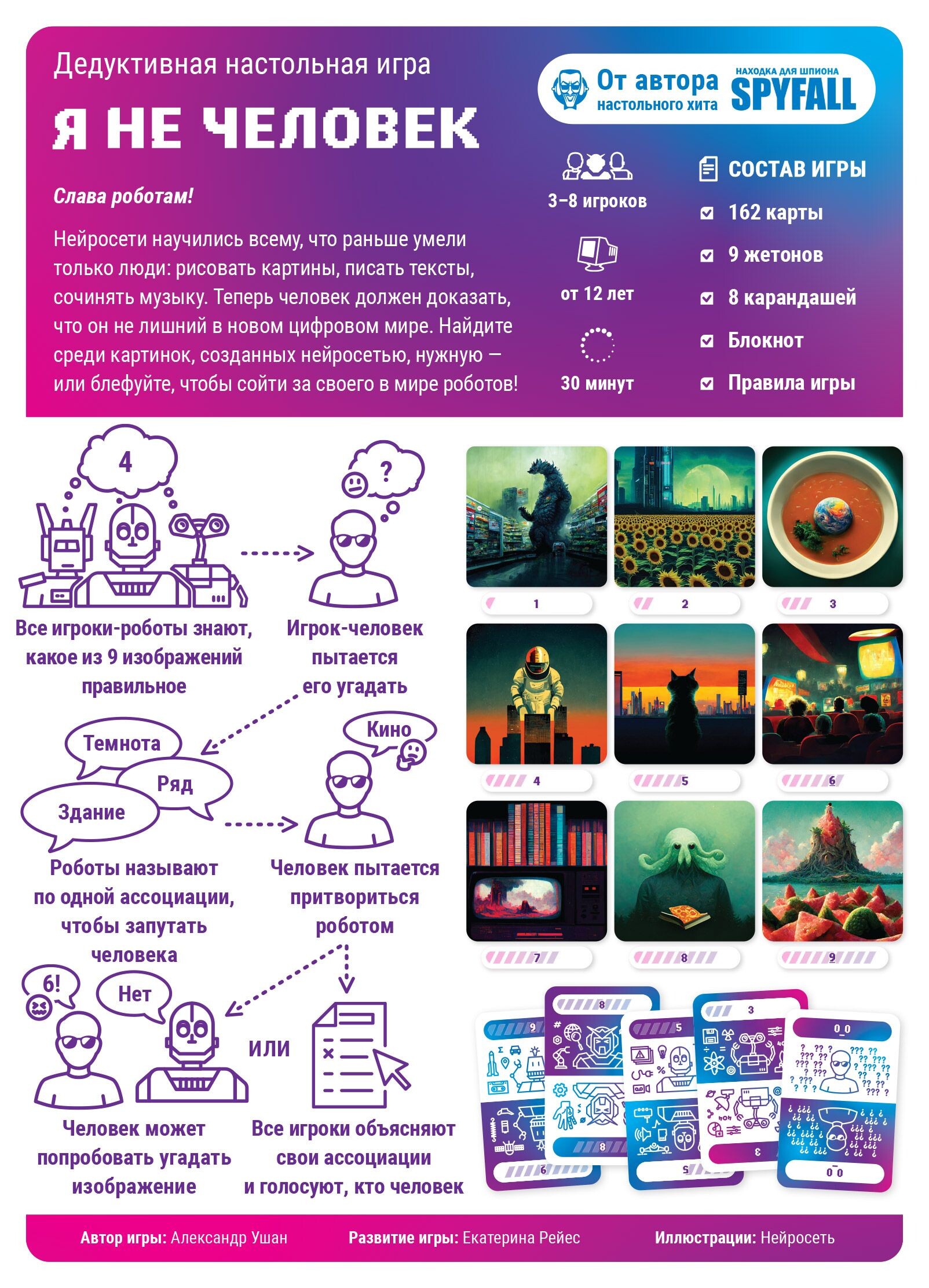 В данной увлекательной игре каждый участник возьмет на себя роль робота, в то время как один из игроков станет человеком. Роботам необходимо будет догадаться, кто является человеком, в то время, как человеку предстоит не выдать себя и правильно угадать изображение, карты с которым достанутся игрокам. Раздав карты с изображениями друг другу, участники называют ассоциацию на правильную карту, причем человеку тут нужно постараться не прогадать и дать правильный ответ. Тогда победа в раунде достанется ему, в противном случае машины победят органику. А ведь роботы могут заняться обсуждением и, в конечном итоге, вычислить человека!