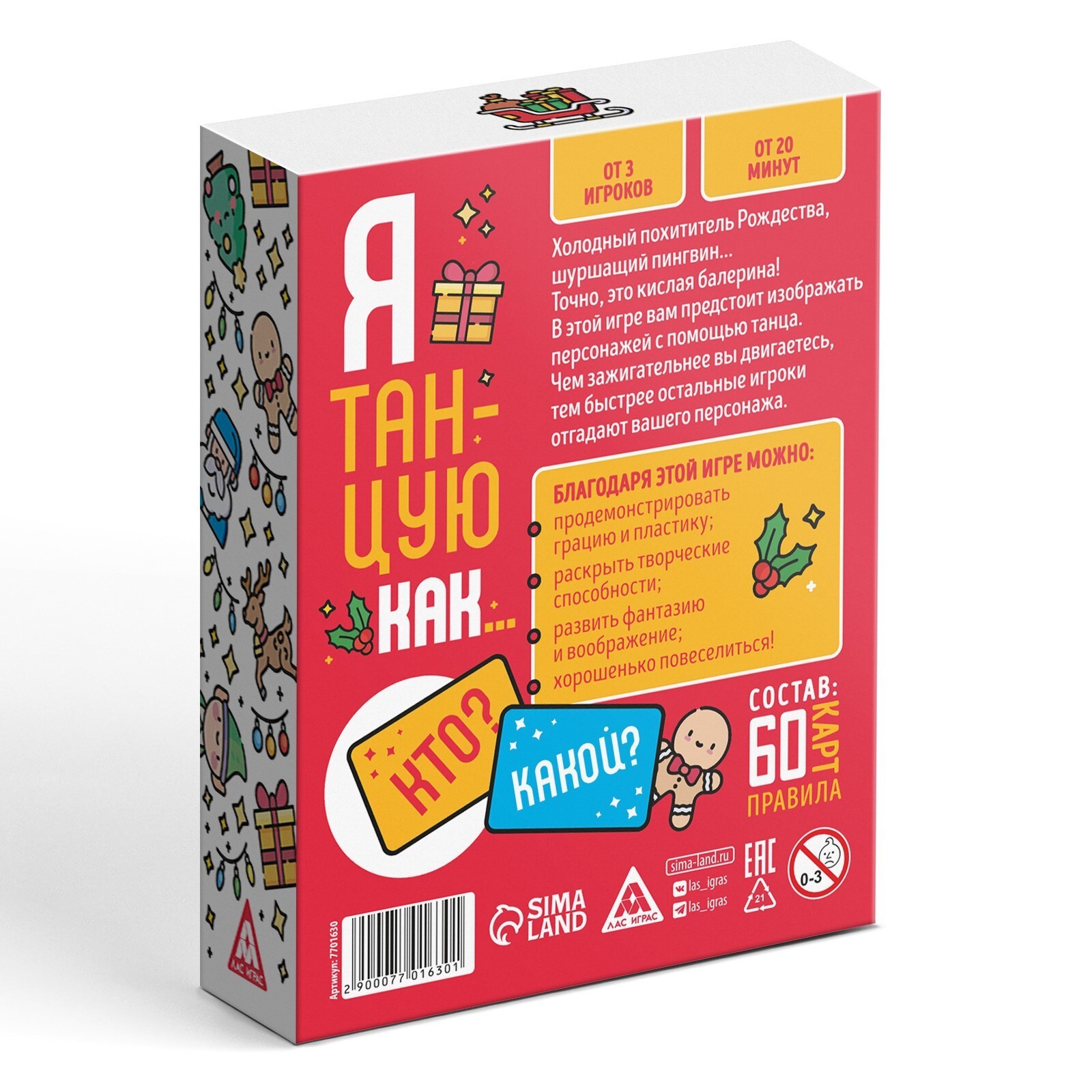 Данное веселое соревнование в новогодней тематике проверит ваш уровень артистизма. В коробке вы найдете различные карточки с именами различных персонажей, а также карты с их качествами. Игроку нужно будет показать выбранные карты с помощью танца так, чтобы другие участники смогли отгадать, кто же имеется ввиду. Тот, кто сможет отгадать наибольшее количество персонажей, станет победителем!