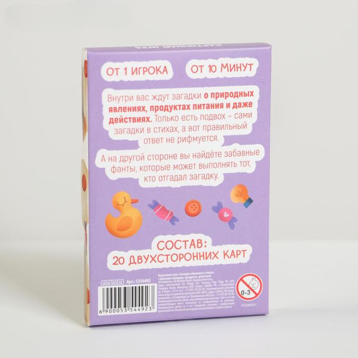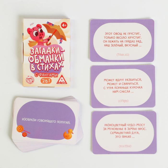 Внутри небольшой коробки вас ждут веселые стихи, в конце которых по описанию нужно угадать, что имеется ввиду. Но сложность заключается в том, что правильный ответ не рифмуется. Если же вы нашли ответ, то в награду вам выпадет забавное задание, которое нужно выполнить. Играйте в одиночку, или большой компанией, и проведите время весело!