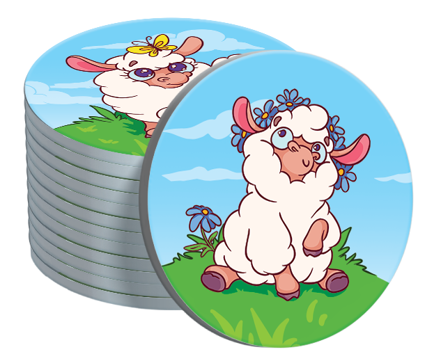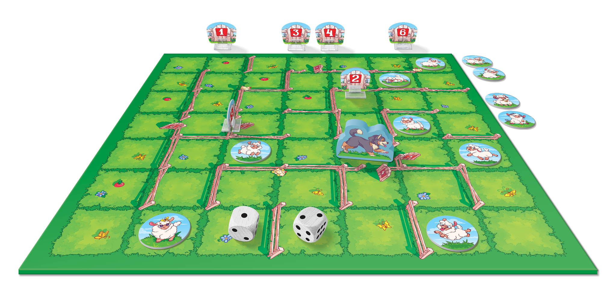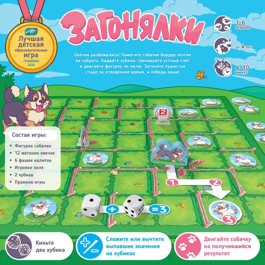 Фигурка собачки12 жетонов овечек6 фишек калитокИгровое поле2 кубикаПравила игры