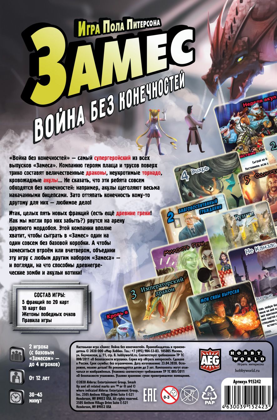 Игры серии "Замес" предлагают вам поучаствовать в самых эпичных и абсурдных сражениях. Соединяя драконов и супергероев, древних греков и акуло-людей, игроки стараются захватить базы соперника и всячески насолить оппоненту. А сделать это будет весьма несложно, ведь теперь безумных комбинаций и уникальных способностей еще больше! Вы можете сыграть в данную версию отдельно, либо объединить ее с любым другим набором серии "Замес", отчего игровой процесс станет еще интереснее и веселее!