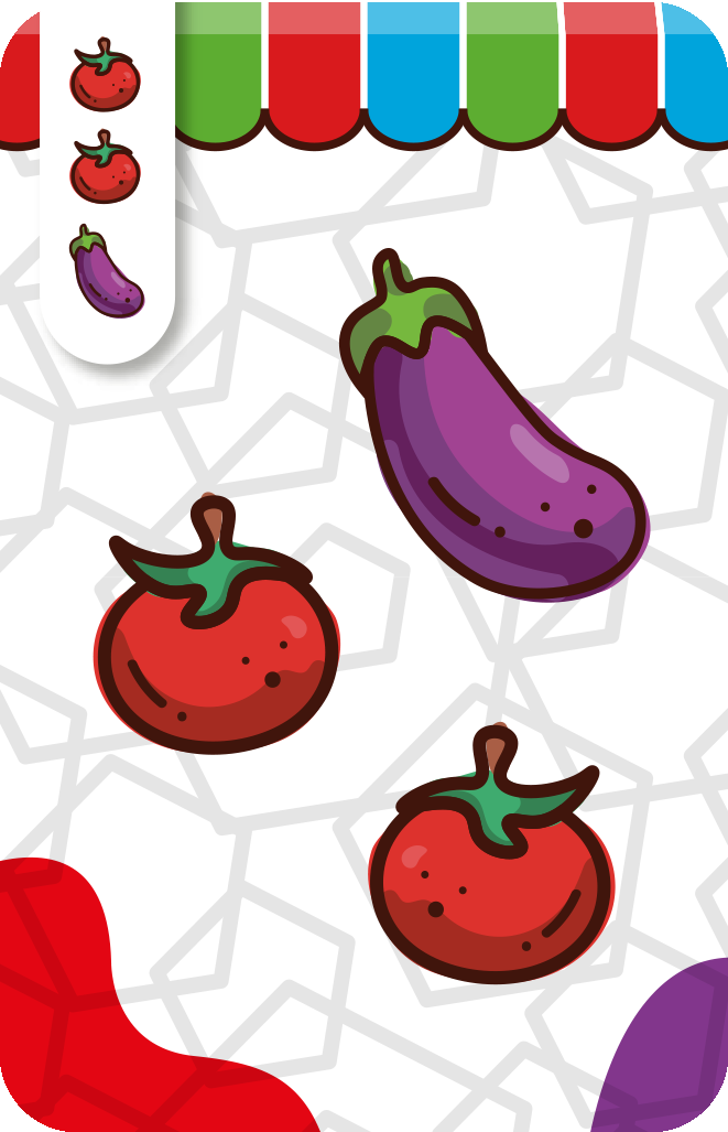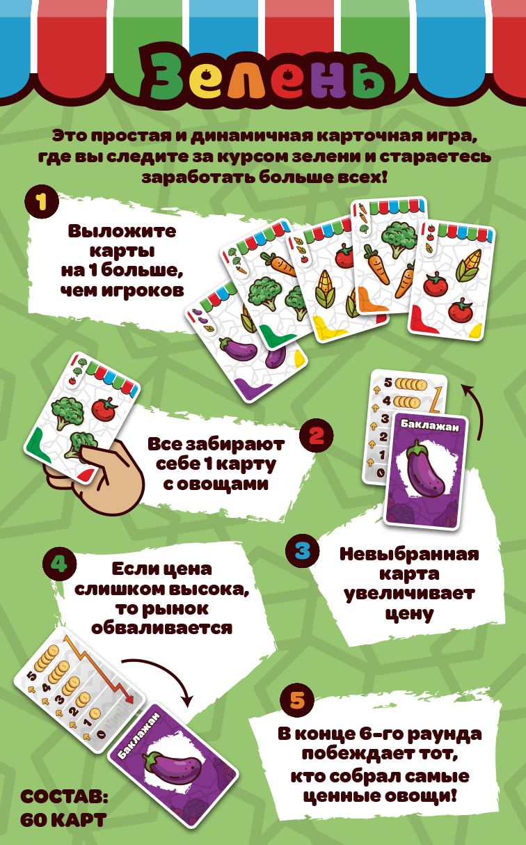 В данной карточной игре участников ждут торги на овощном рынке. По очереди забирайте карты с овощами с центра стола. Та, которая останется, будет повышать цену определенного продукта среди карт в ваших руках. Если любой овощ станет цениться больше своей стоимости, произойдет сброс цены до нуля, чтобы потом опять подорожать. Таким образом, после шестого раунда, вам нужно будет посчитать овощи в своих руках и их рыночную стоимость. Если вы наберете наибольшее количество очков, то станете победителем и лидером на рынке!