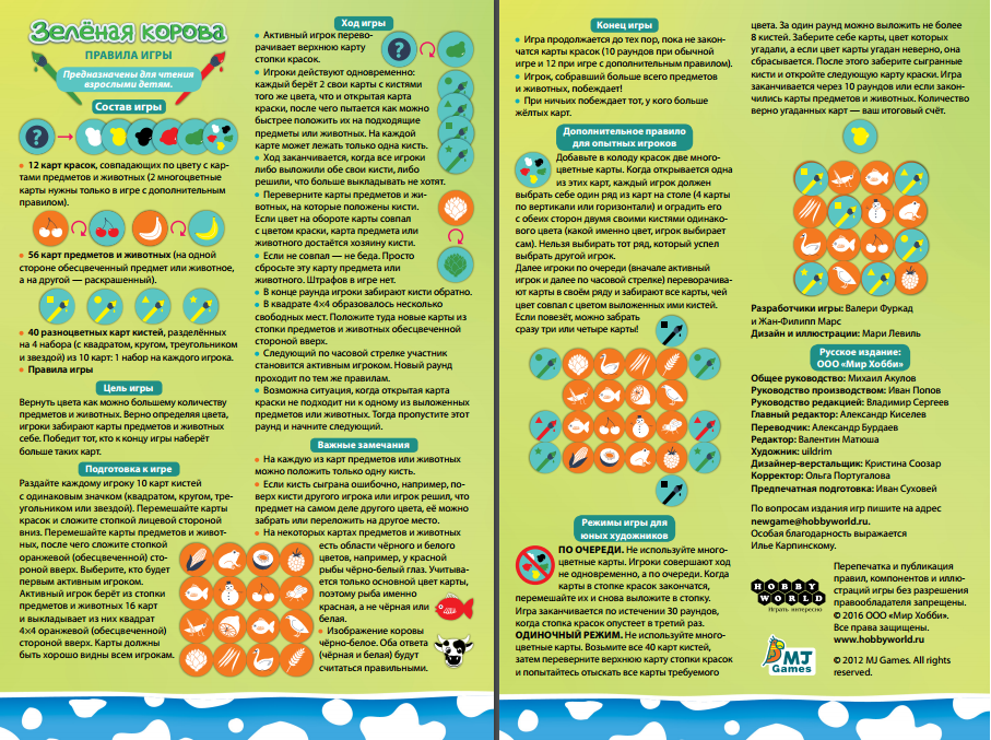 В настольной игре "Зеленая корова" игроки посоревнуются, кто быстрее закрасит нужным цветом определенные предметы. Всем раздаются жетоны кистей определенного цвета, а карты с предметами и животными выкладываются обесцвеченной стороной наверх, после чего участникам нужно как можно быстрее положить свои кисти на карты того же цвета. Как только все это сделают, карты с предметами и животными переворачиваются и идет проверка, совпал ли цвет на рисунке с вашей кистью. Игрок, сумевший закрасить правильно большинство карт, станет победителем.