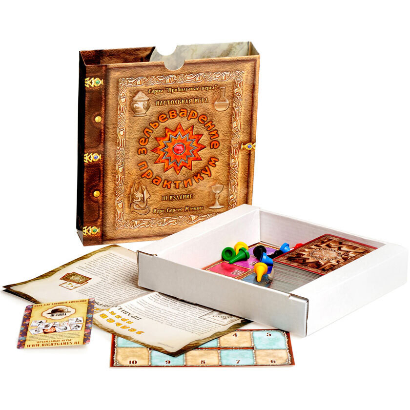 Вы когда-нибудь мечтали стать учеником школы магии? Настольная игра "Зельеварение" приоткроет дверь в мир волшебства и даст вам такую возможность! С помощью карт игроки будут собирать компоненты для создания зелий, талисманов и магических существ. Начинают все с четырьмя картами на руке, после чего алхимики могут совершить одно из действий - выложить новый элемент на стол, получив за это очки; взять карту со стола, дабы завершить магическую формулу; объединить простые формулы в более сложные, увеличив число победных очков, и даже использовать заклинания, дабы преобразовать одну формулу в другую. За каждое завершенную задачу алхимики получают победные очки, и победит в этом карточном противостоянии лучший! Котел кипит, самое время закинуть туда побольше ингредиентов и обойти соперников!