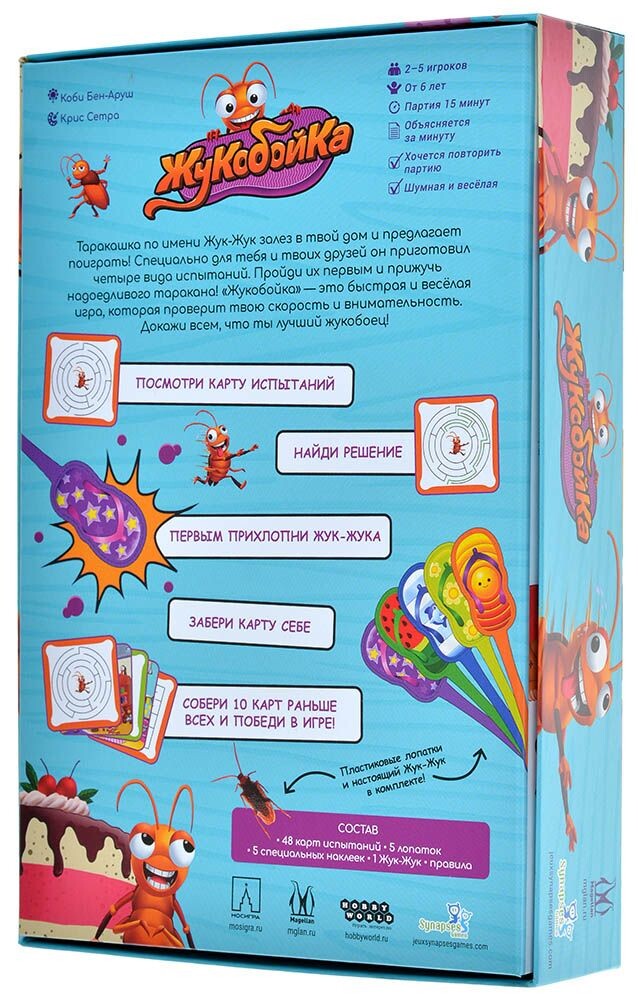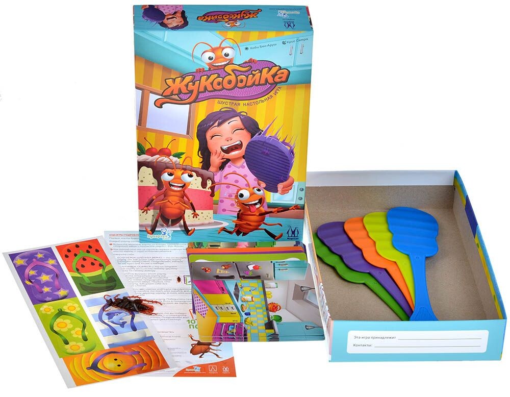 Собирайтесь всей семьей за одним столом и выясните, кто из вас самый быстрый и внимательный! Каждый из игроков получит специальную мухобойку, после чего участники по очереди будут открывать карты с заданиями. Здесь предстоит быть крайне внимательным и ответить на один из вопросов, который предложит игра - к примеру, понять по рисунку лабиринта, сможет ли из него выбраться таракан. Если ответ положительный, тогда вам нужно быстро ударить по фигурке таракана, а если ответ отрицательный - тогда удар придется по карте задания. Игроки действуют одновременно, поэтому вас легко может кто-нибудь опередить! Но скорость не всегда является определяющим фактором - если вы ошибетесь в своем ответе, тогда одну из карт придется отдать другому участнику. Победит тот игрок, кто сможет первым собрать десять карт!