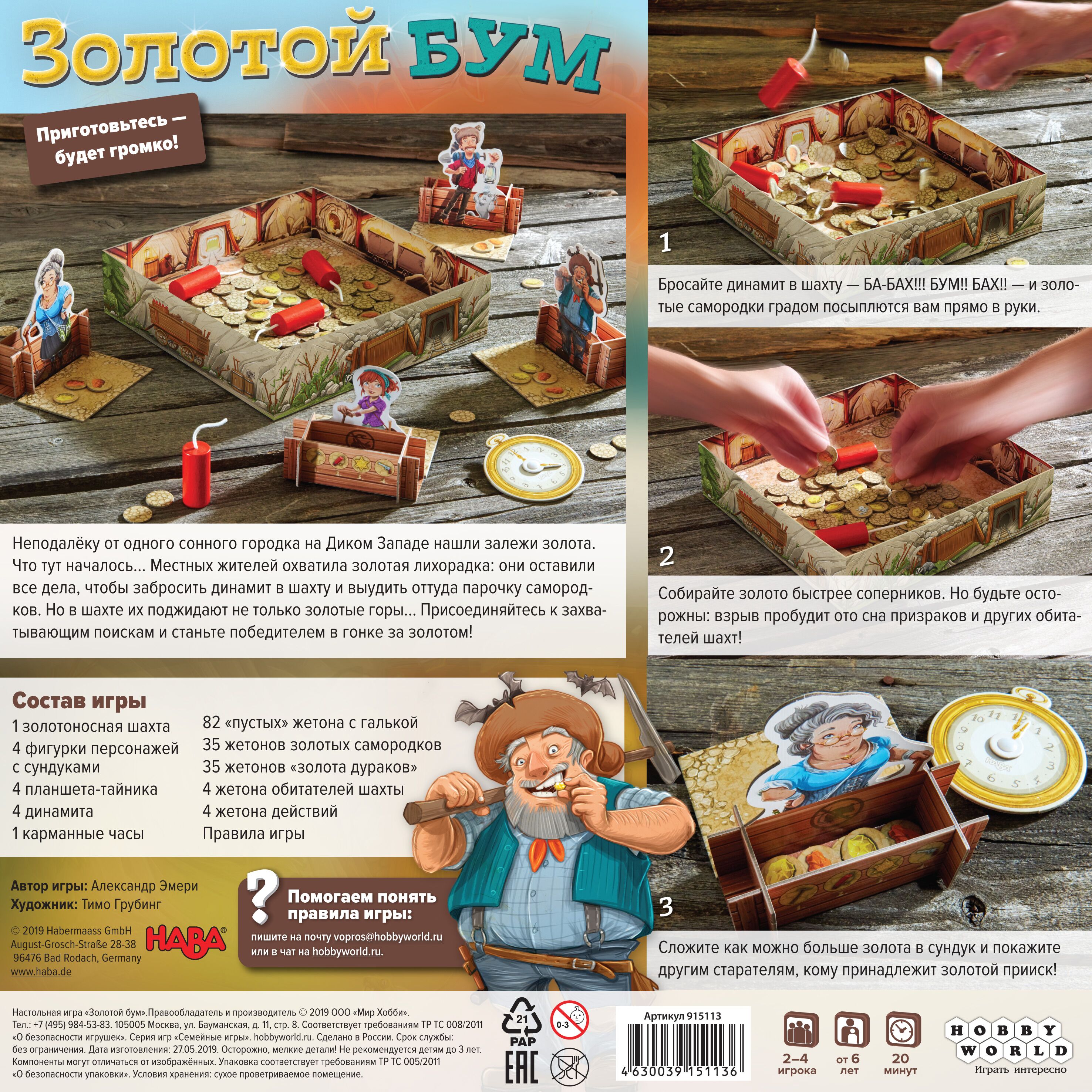 Дикий Запад - место опасное, но манящее. Поддавшись золотой лихорадке, множество авантюристов отправляются добывать золото, и вы в их числе! Полчища крыс и летучих мышей, обитающих в темных туннелях шахт, нисколько вас не остановят, ведь золотые самородки столь притягательны! В настольной игре "Золотой бум" игроки будут соревноваться в золотодобыче. Открыв коробку и взяв в руки по динамиту, они будут бросать его внутрь, а затем стараться собрать как можно больше перевернувшихся от удара жетонов одной рукой. Задача кажется простой, но среди жетонов есть не только золотые самородки, но и животные, каждое из которых замедляет трех из четырех игроков. Таким образом, в одночасье преимущество может оказаться не на вашей стороне. Кто соберет больше всех самородков за 12 раундов, тот станет лучшим золотодобытчиком!