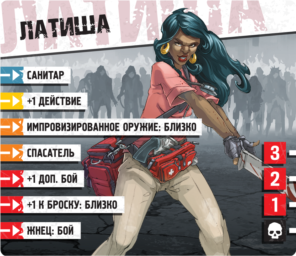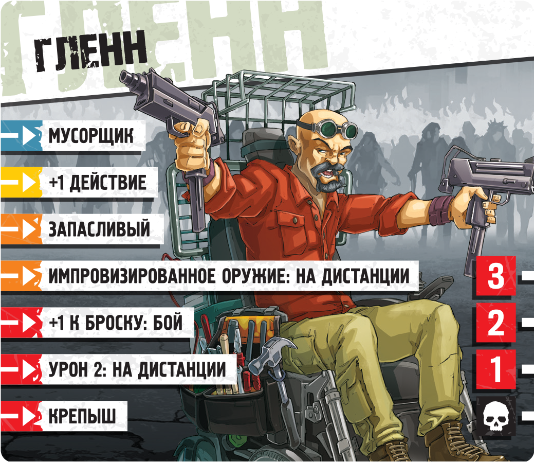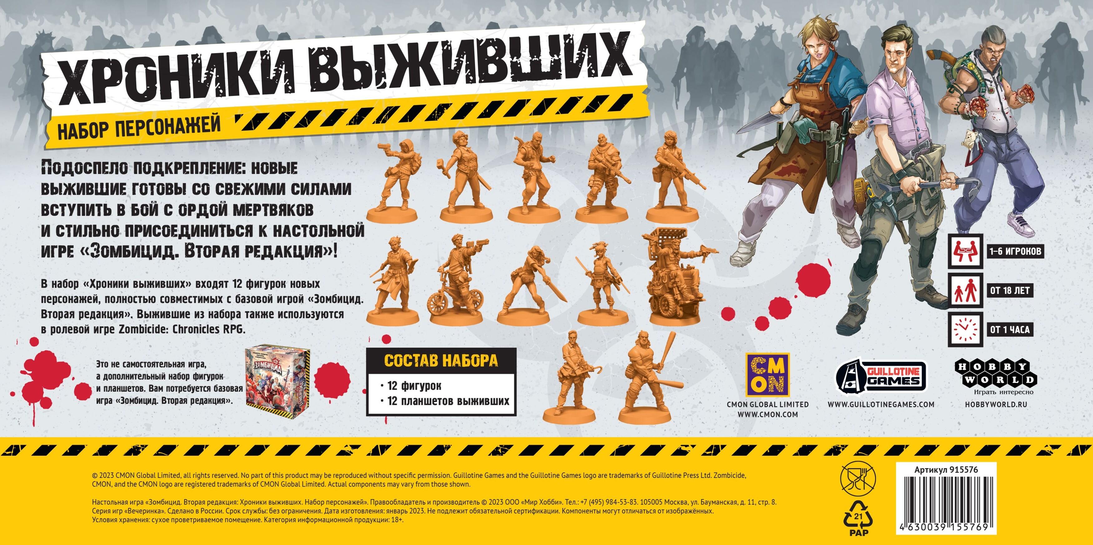 Данный набор включает в себя двенадцать игровых персонажей со своими фигурками и картами. Здесь вас ждет целая палитра харизматичных героев - от водителя автобуса до ветерана боевых действий. Выставляйте персонажей на поле, исследуйте локации, собирайте полезные предметы и сражайтесь с мерзкими зомби. Апокалипсис отменяется!