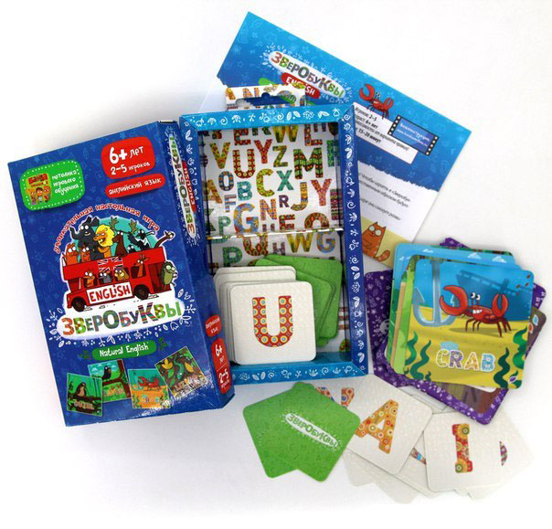 Если вы давно хотели познакомить ребенка с английским языком, данная игра может стать для вас лучшим выбором! Несколько видов правил, яркие иллюстрации и запоминающиеся образы ждут в небольшой коробке. В классическом варианте карты с буквами и карты с милыми зверюшками выкладываются на стол, причем карты с буквами лежат взакрытую. Задача игроков - переворачивая поочередно карты, собрать полное название выбранного животного. Кто откроет последнюю букву в названии, станет на шаг ближе к победе. В других вариантах правил вы сможете потренировать свою память, составить слово из букв и даже сыграть в аналог лото! Данный набор рассчитан на разные уровни знания английского языка, а также содержит памятки с переводом названий животных. Таким образом, данная игра станет отличным стимулом для изучения английского языка и подарит множество веселых моментов.
