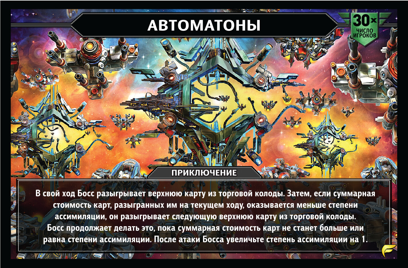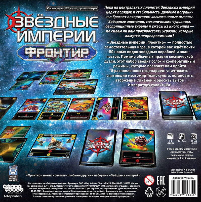 Большое дополнение для культовой настольной игры "Звездные империи" предложит игрокам новые возможности и механики, будет хорошим подспорьем для начинающих знакомиться с серией игроков и позволит сыграть в сценарные режимы. Более того, данная игра является самостоятельной и рассчитана на четырех игроков, при желании вы можете смешать ее с другими частями серии. С помощью карт приобретайте новые корабли, наращивайте мощь космического флота и сразитесь с противником. Получится ли у вас разгадать его стратегию и победить?